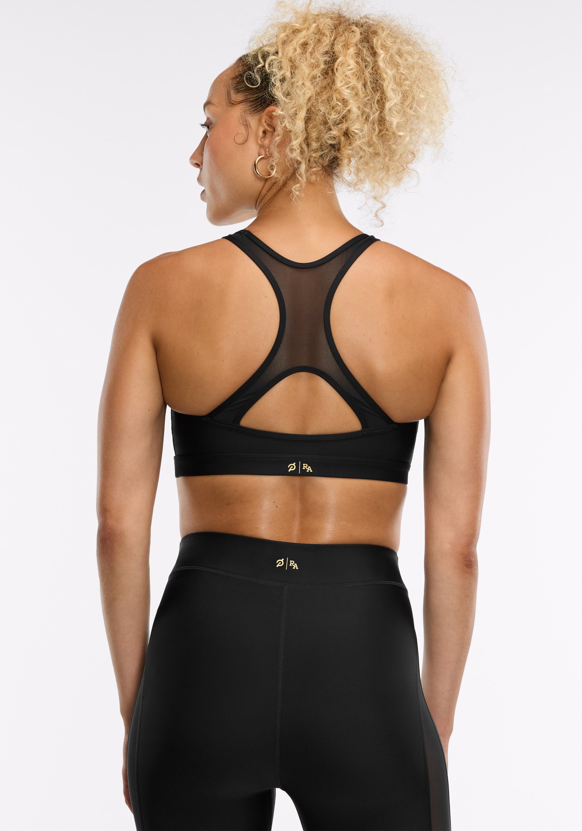 Low-Medium support bra with mesh panels at front and back, elastic bottom band, and interior cup pockets