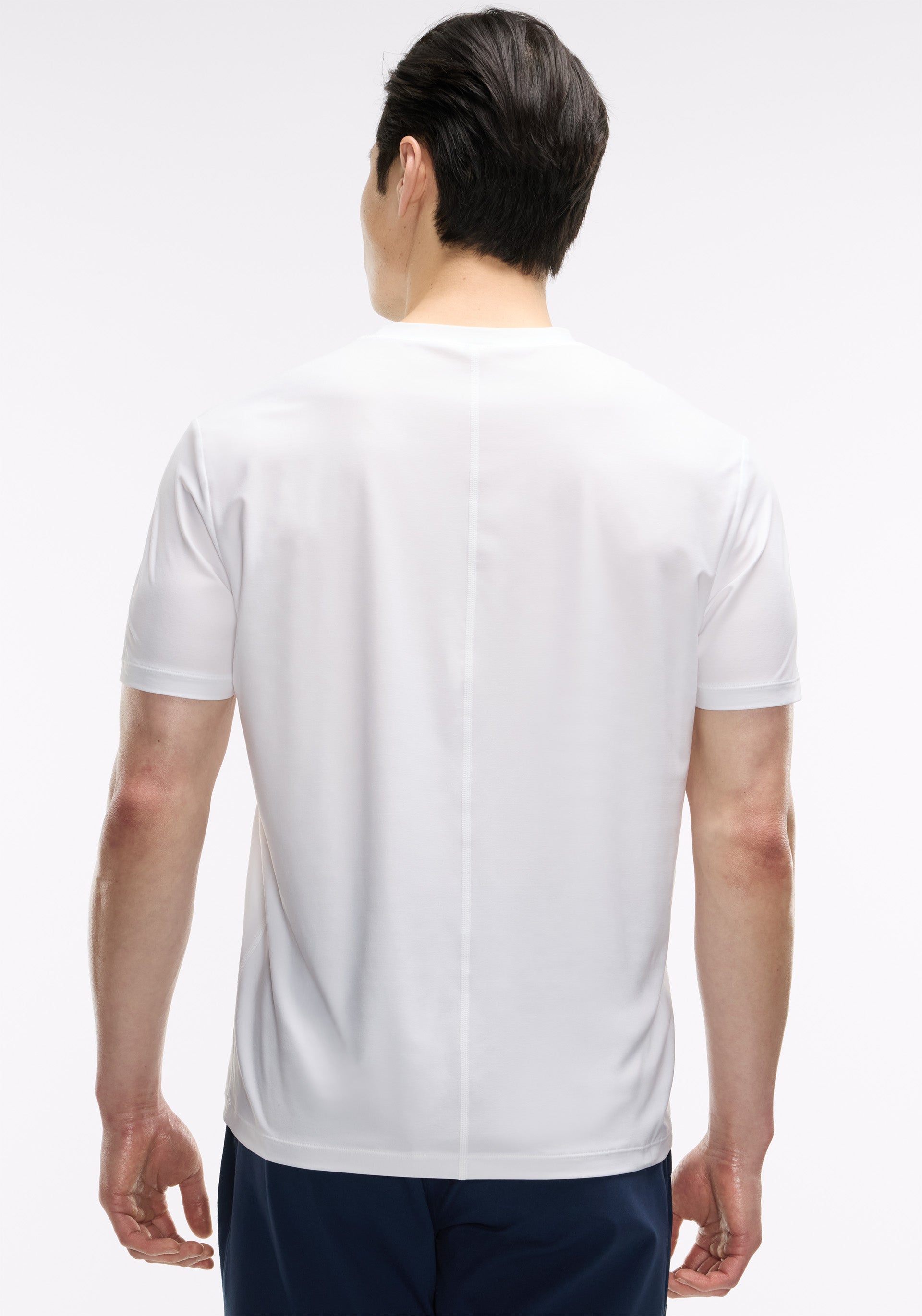 Crewneck, short-sleeve shirt with center back seam and self neckline and hem