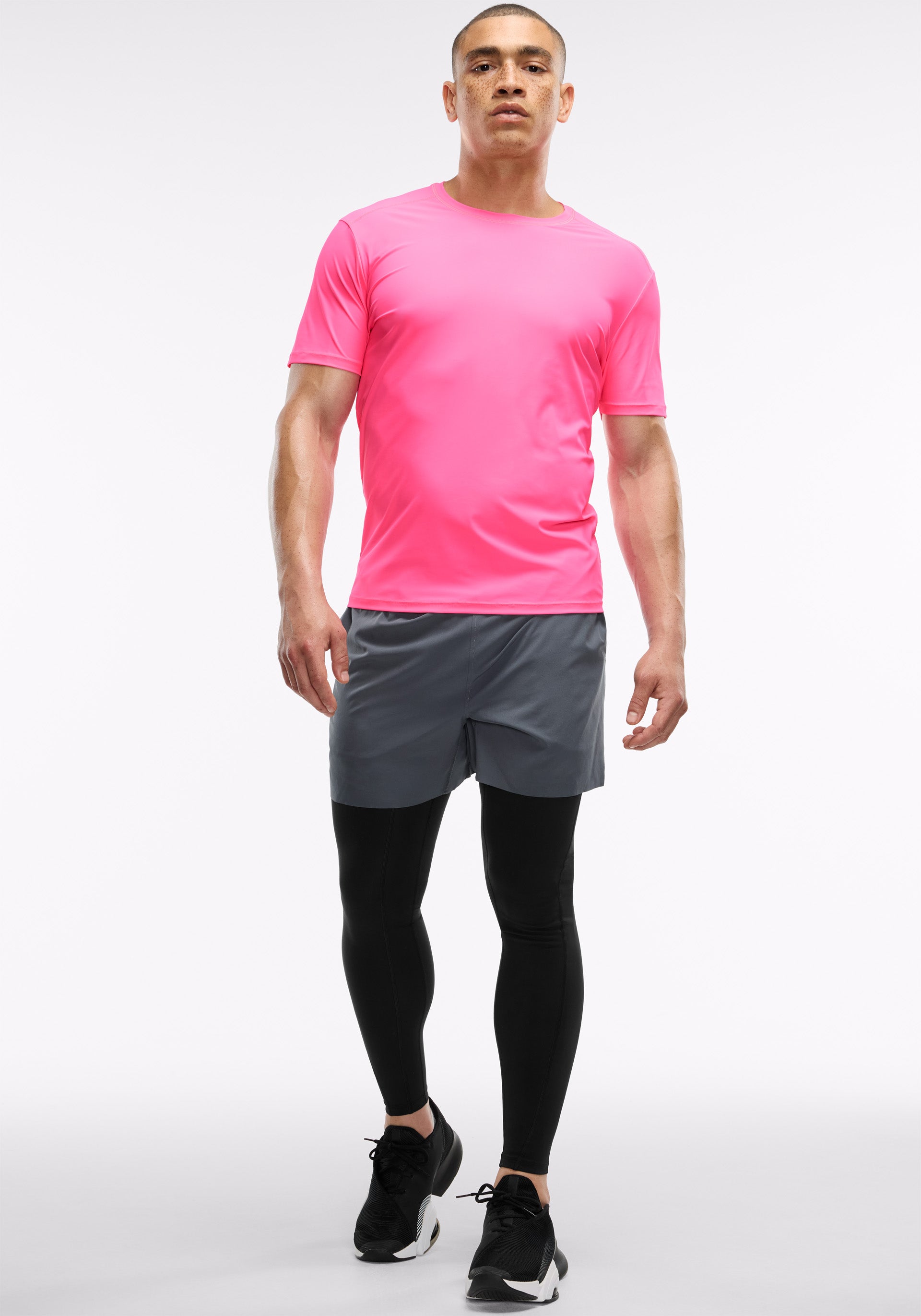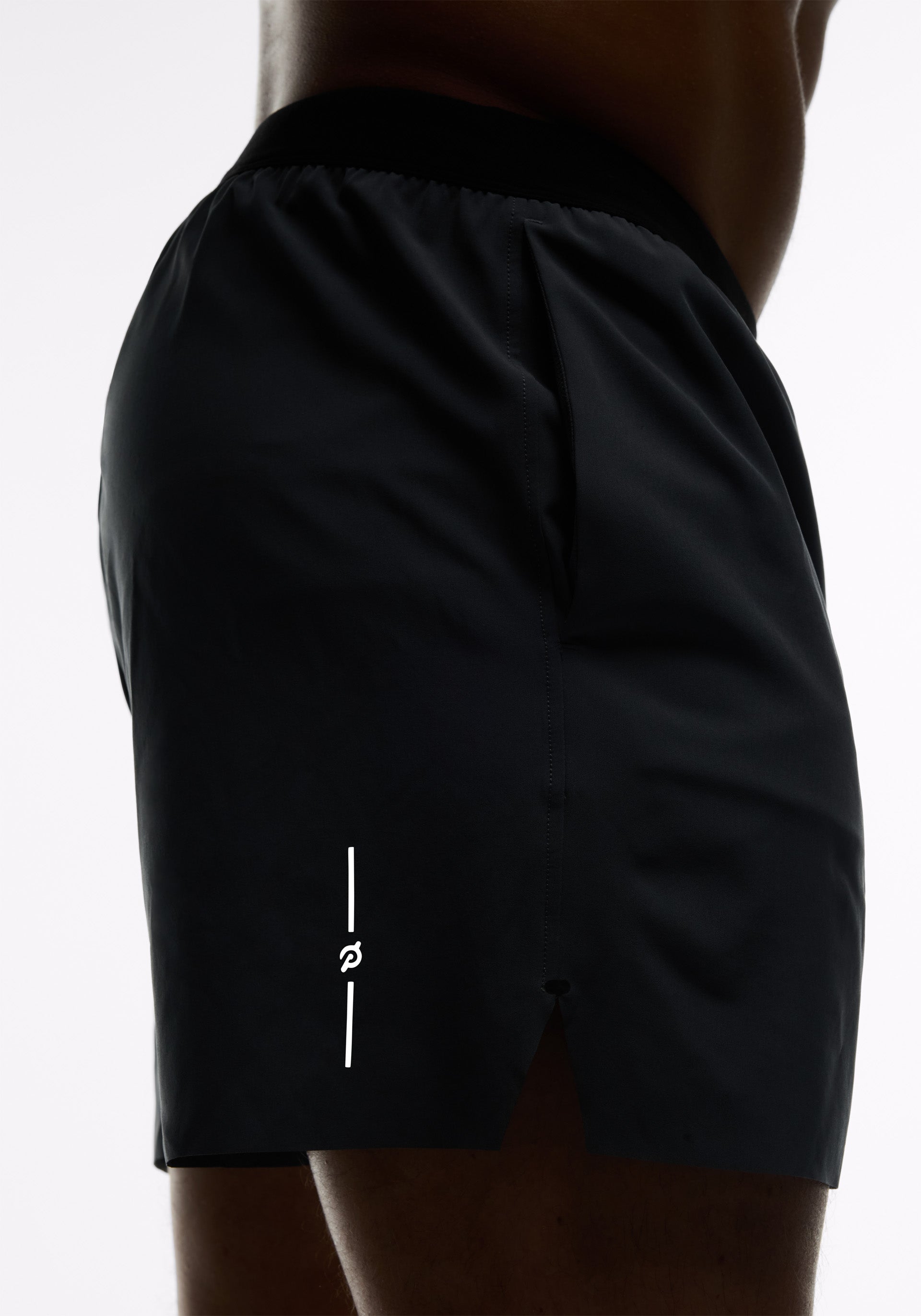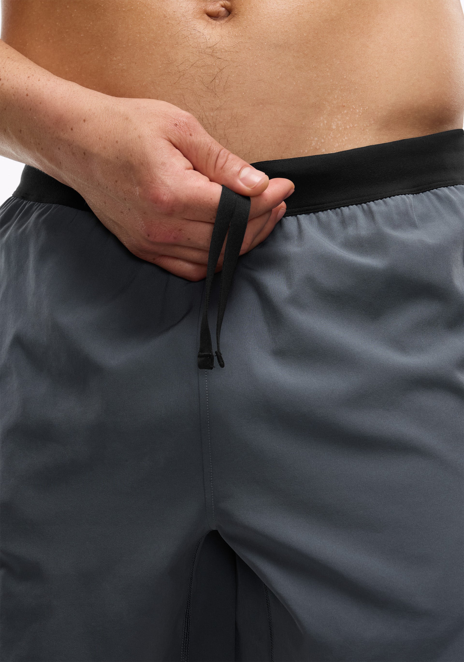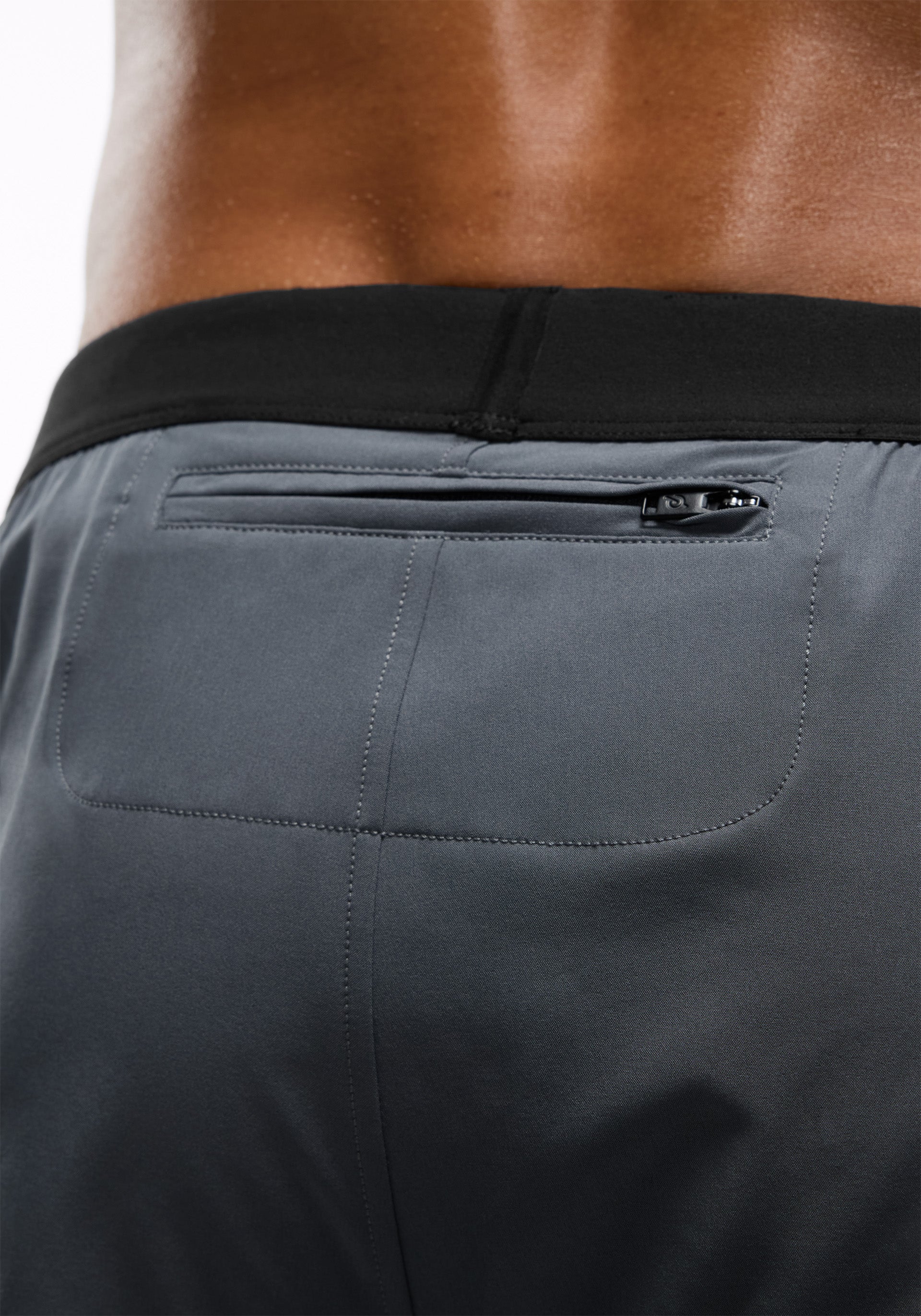 • 5" inseam brief-lined short with elastic waistband, interior drawcord, functional gusset, side hand pockets, and center back zip pocket