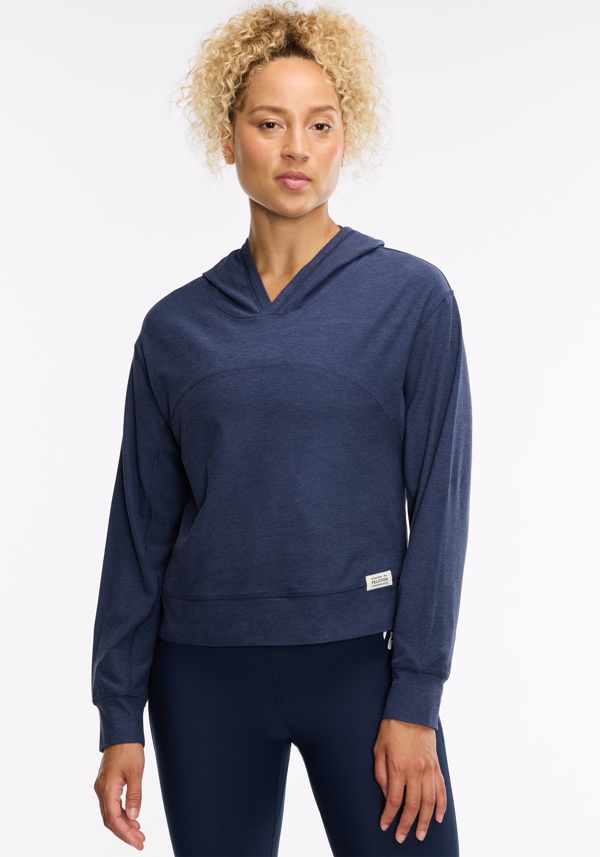 Pullover hoodie with a meet and greet length, curved yoke detail, as well as self cuffs and bottom hem