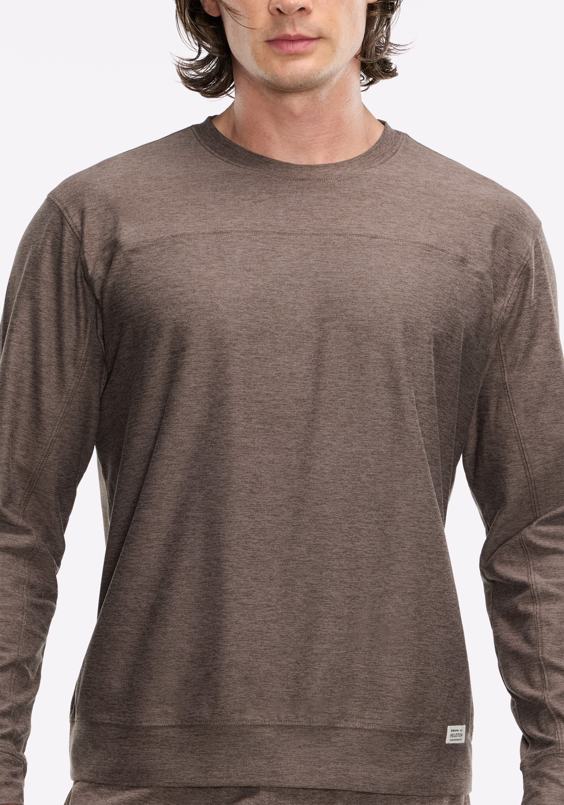 • Crewneck, pullover with curved yoke detail, and self cuffs and bottom hem