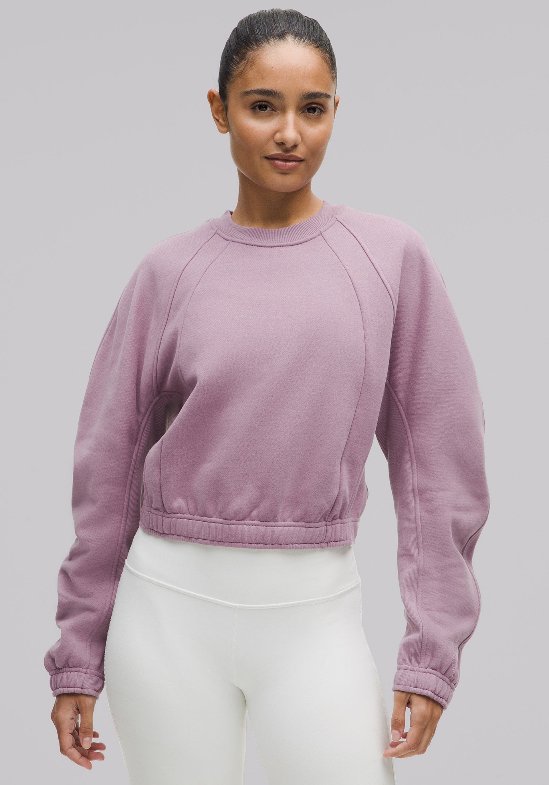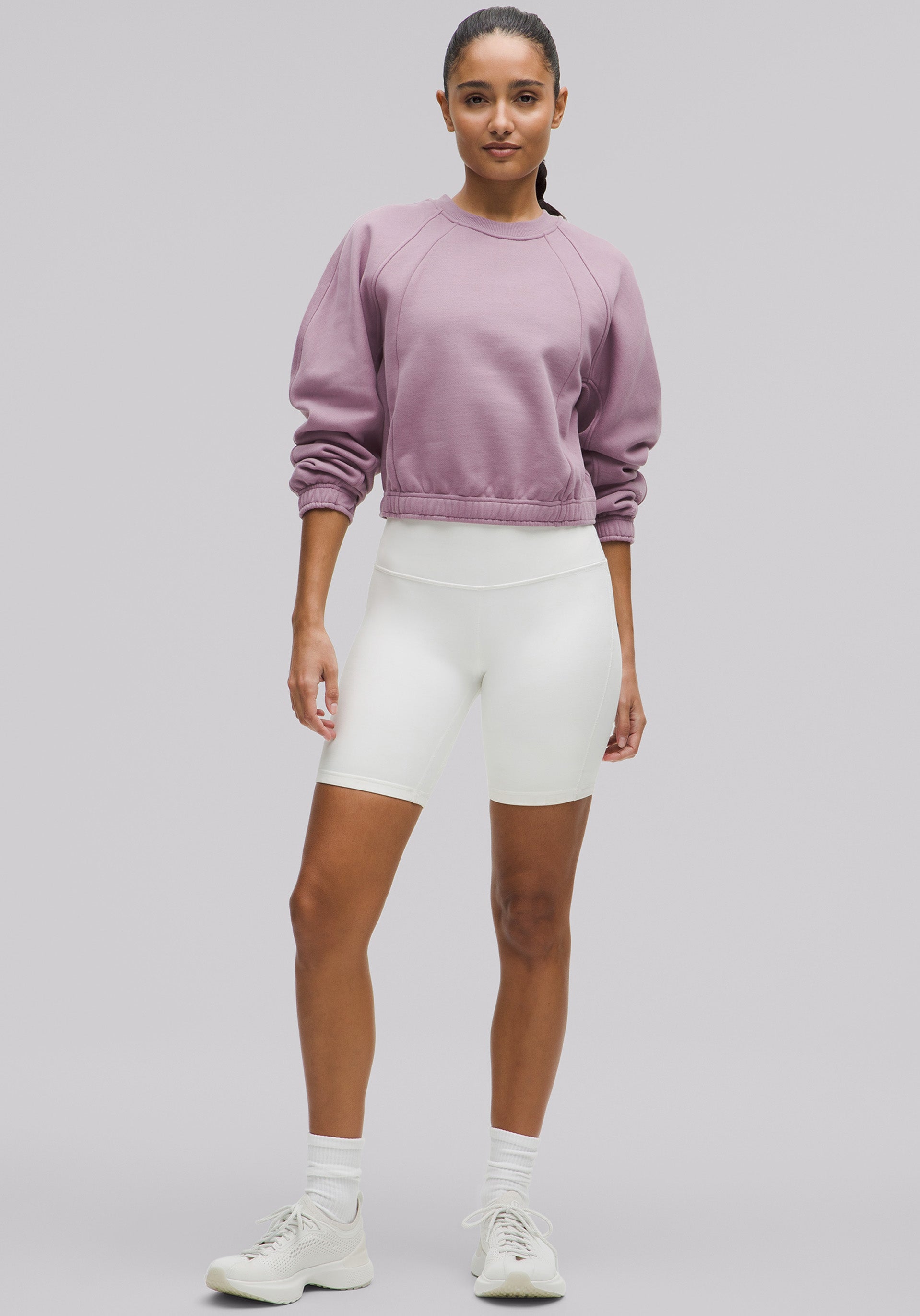 Serious about softness. This fleecy crewneck sweatshirt delivers volume up top with a cropped length and fitted hem that nips in at the waist.