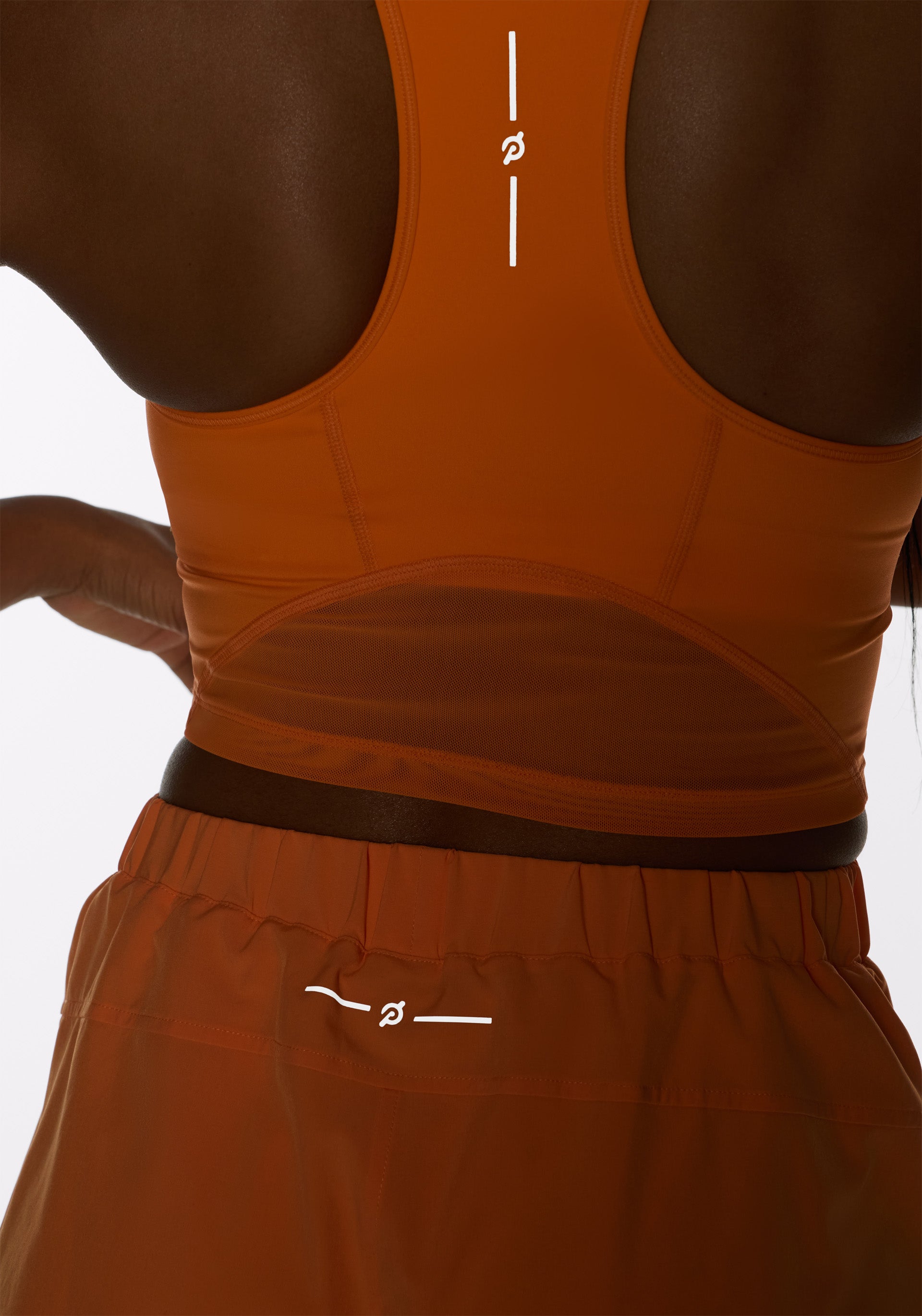 High rise short with brief liner, elastic waistband, reflective style lines, and side seam slits for ventilation and ease of motion