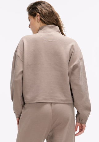 Contrast zipper ¼ zip with elastic cuff, kanga pocket, and half moon stitch at center back neck