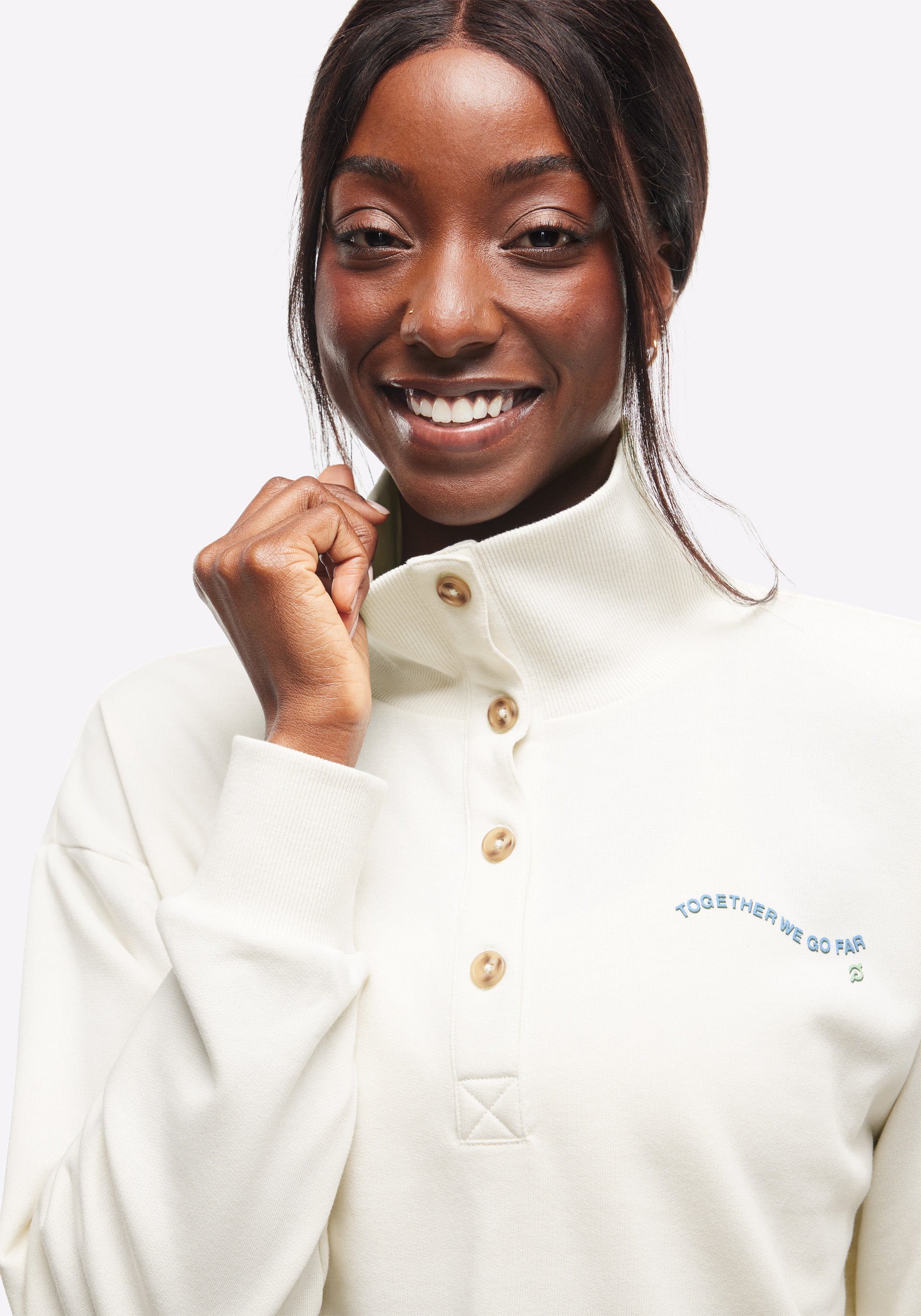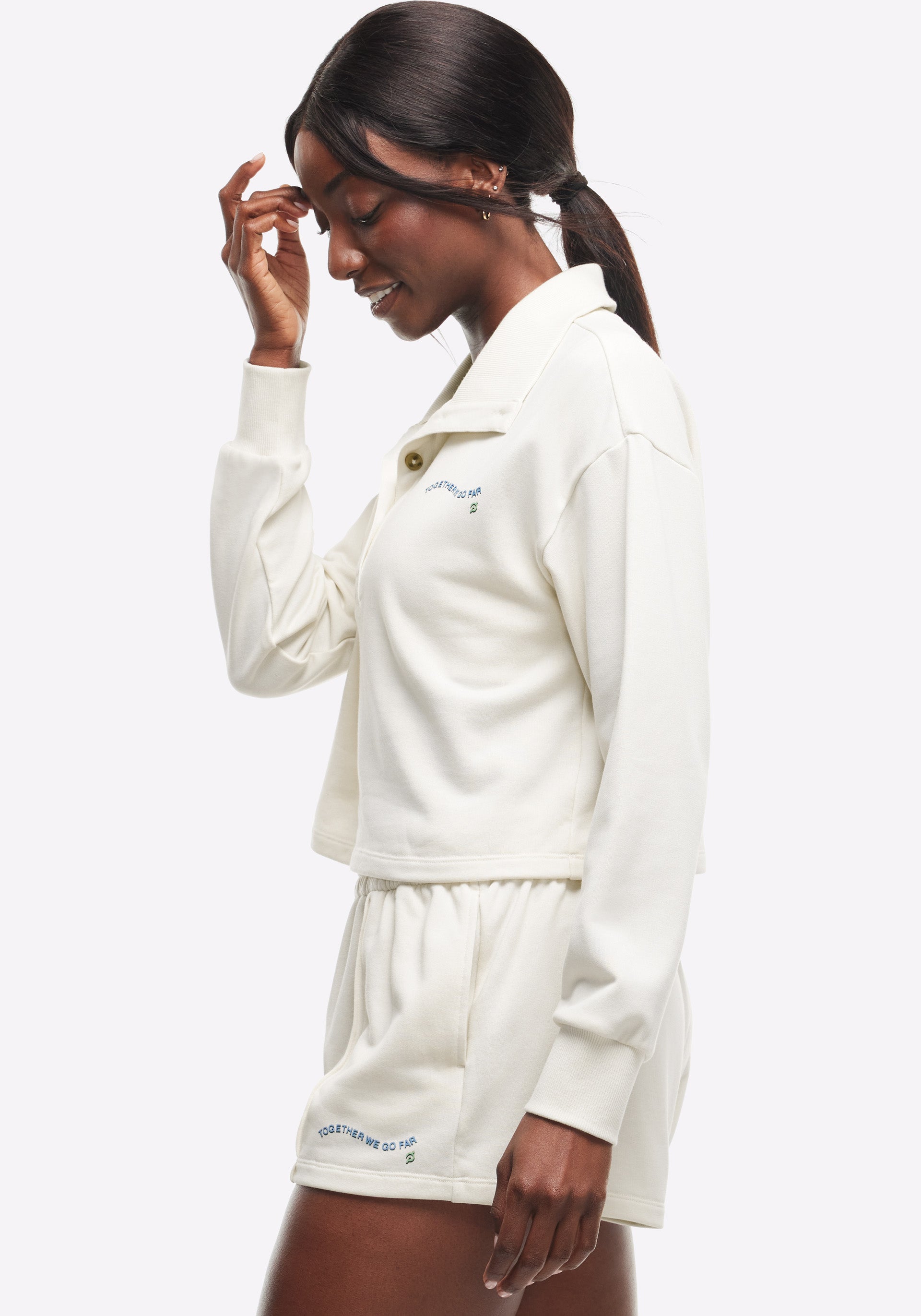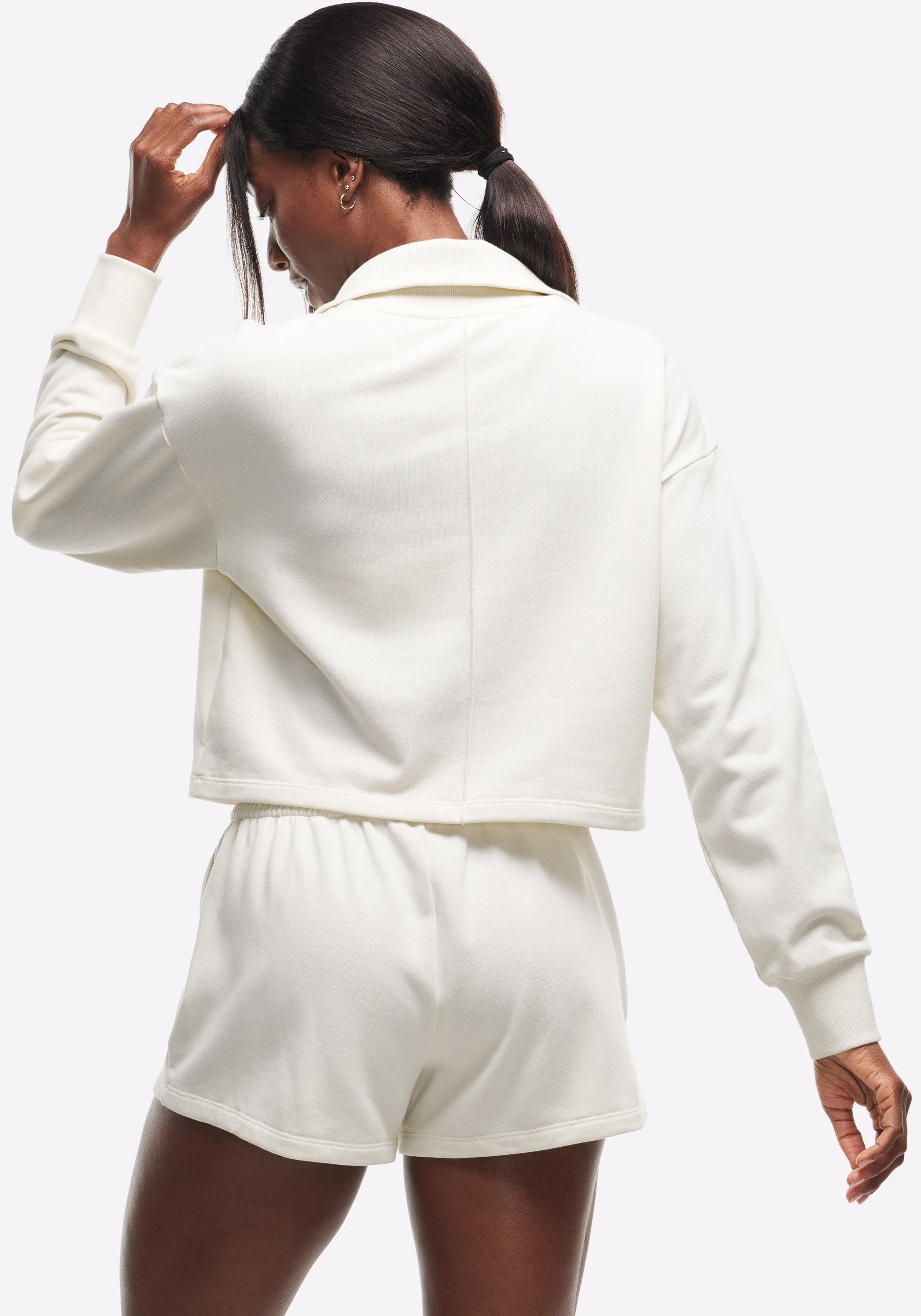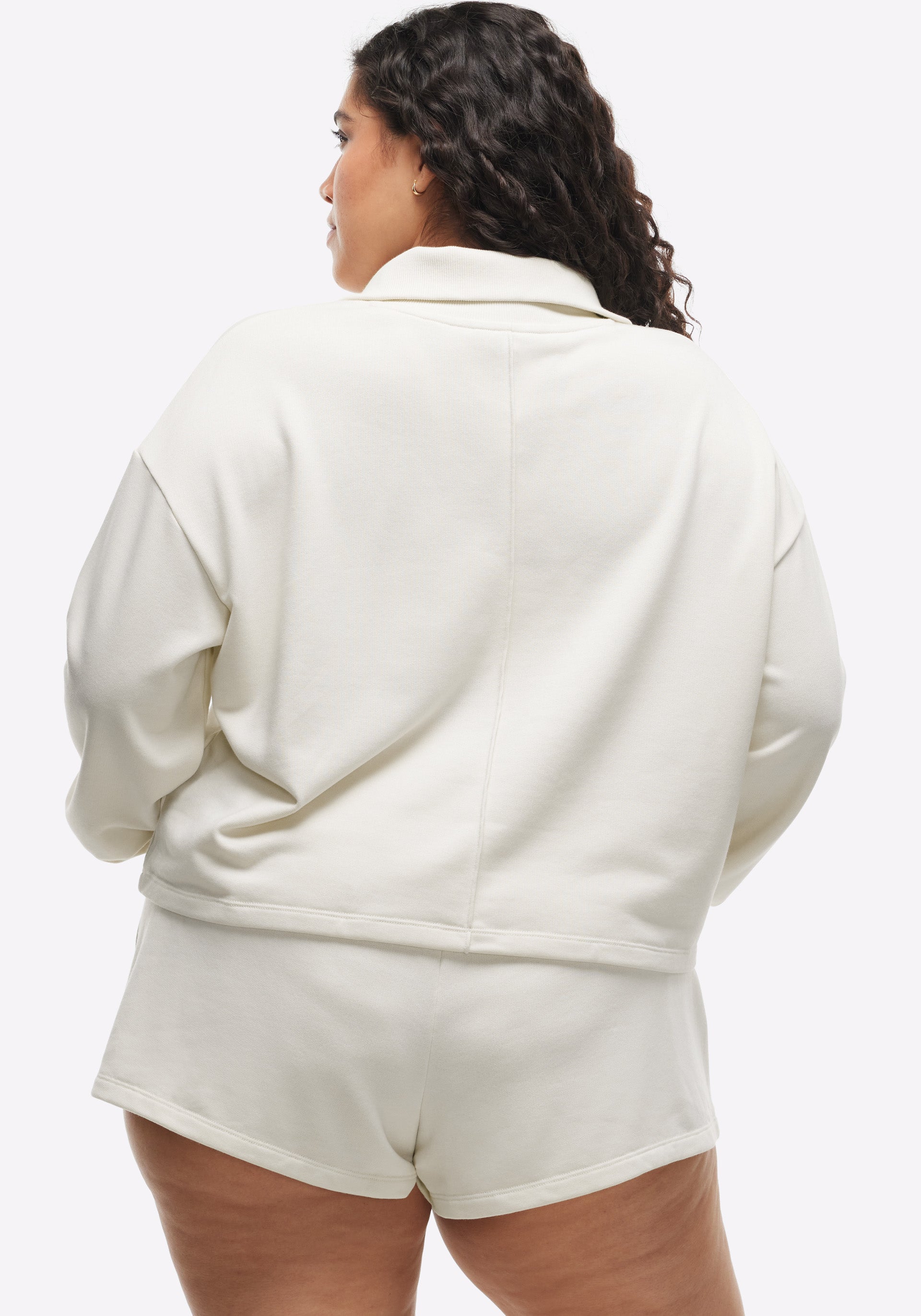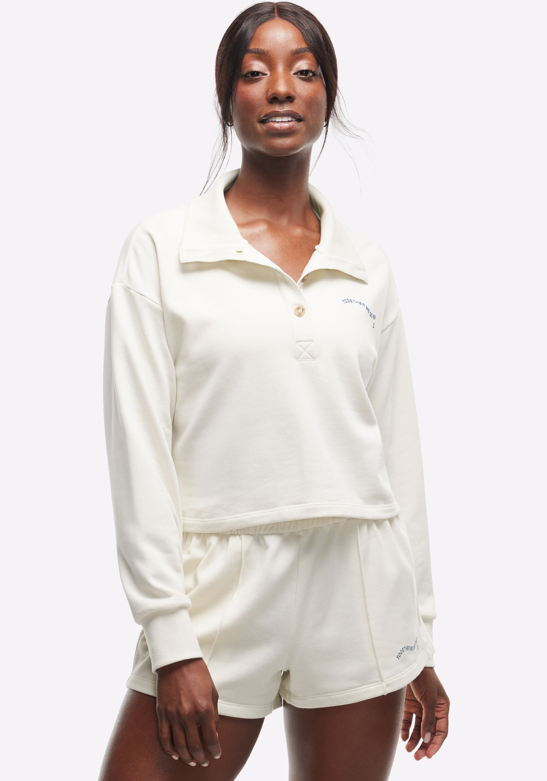 • Cropped, rib mock neck with button placket, pintuck at center back, and rib cuffs