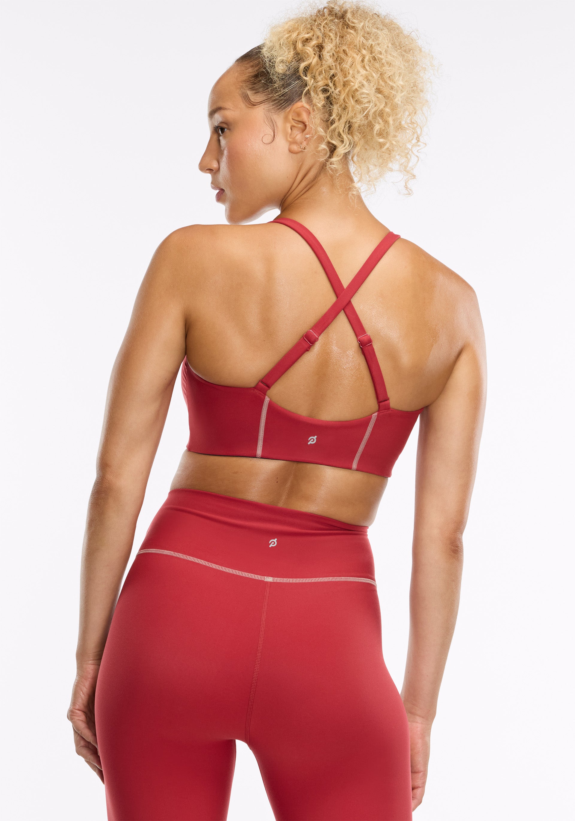 V-neck bra with adjustable straps and interior sweat channel elastic band