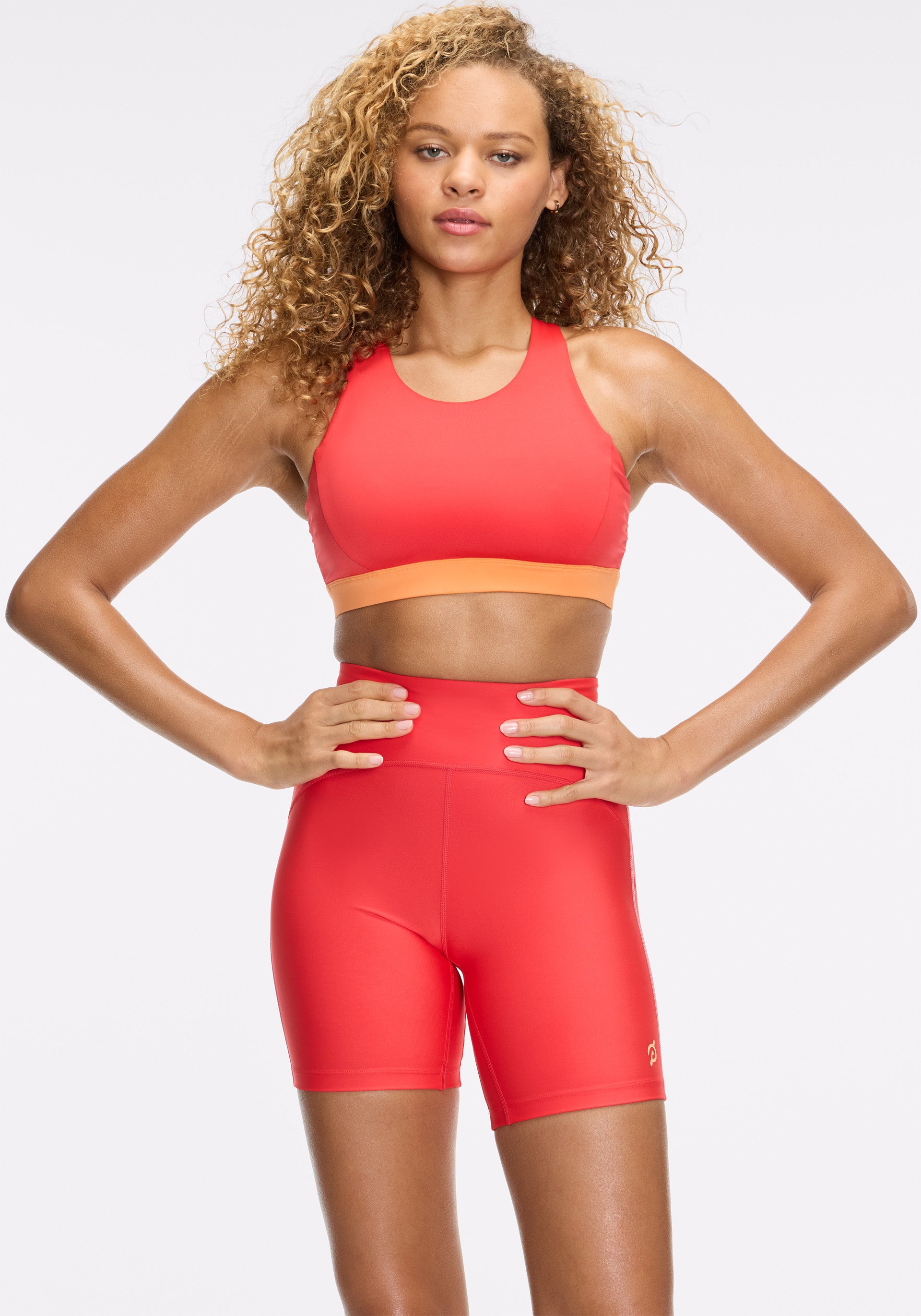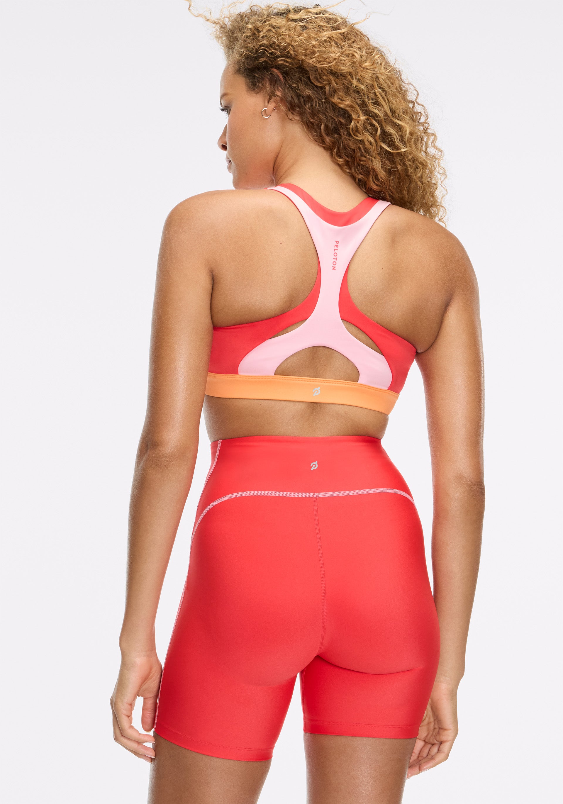 Medium support, high neck bra with colorblocking, projection seams at cups, and interior cup pockets