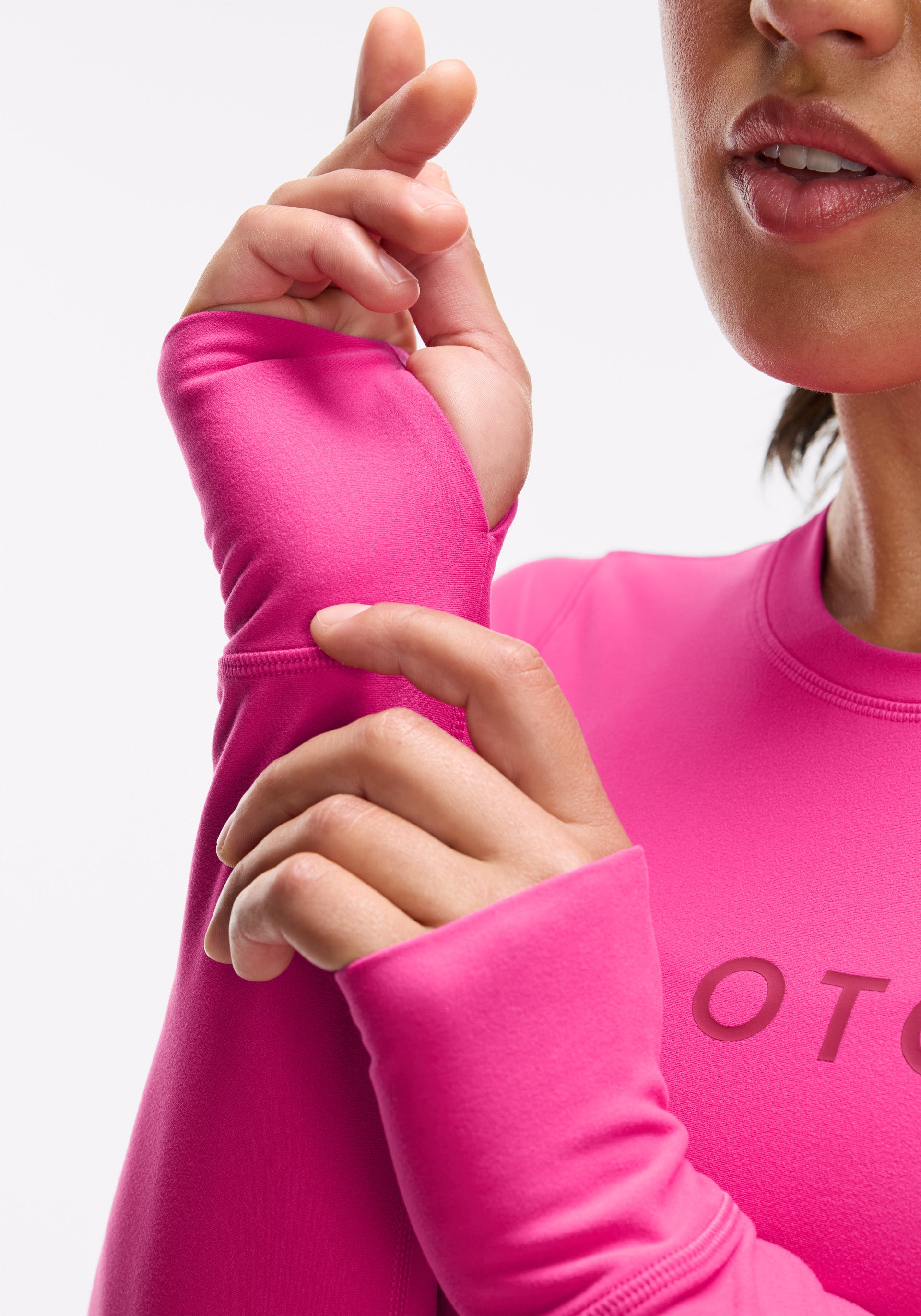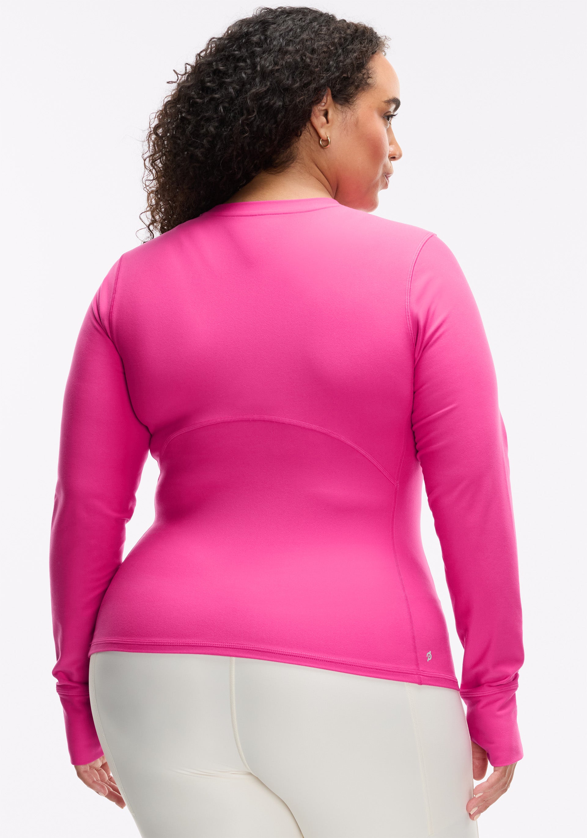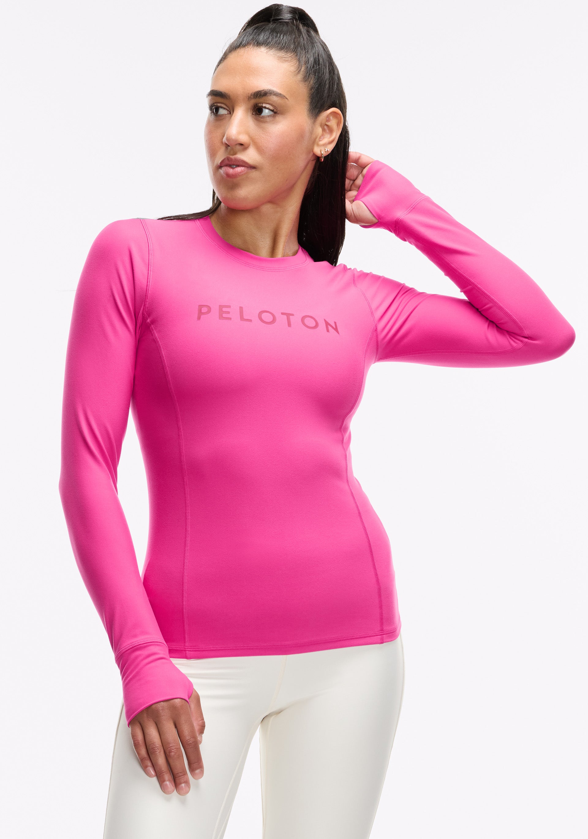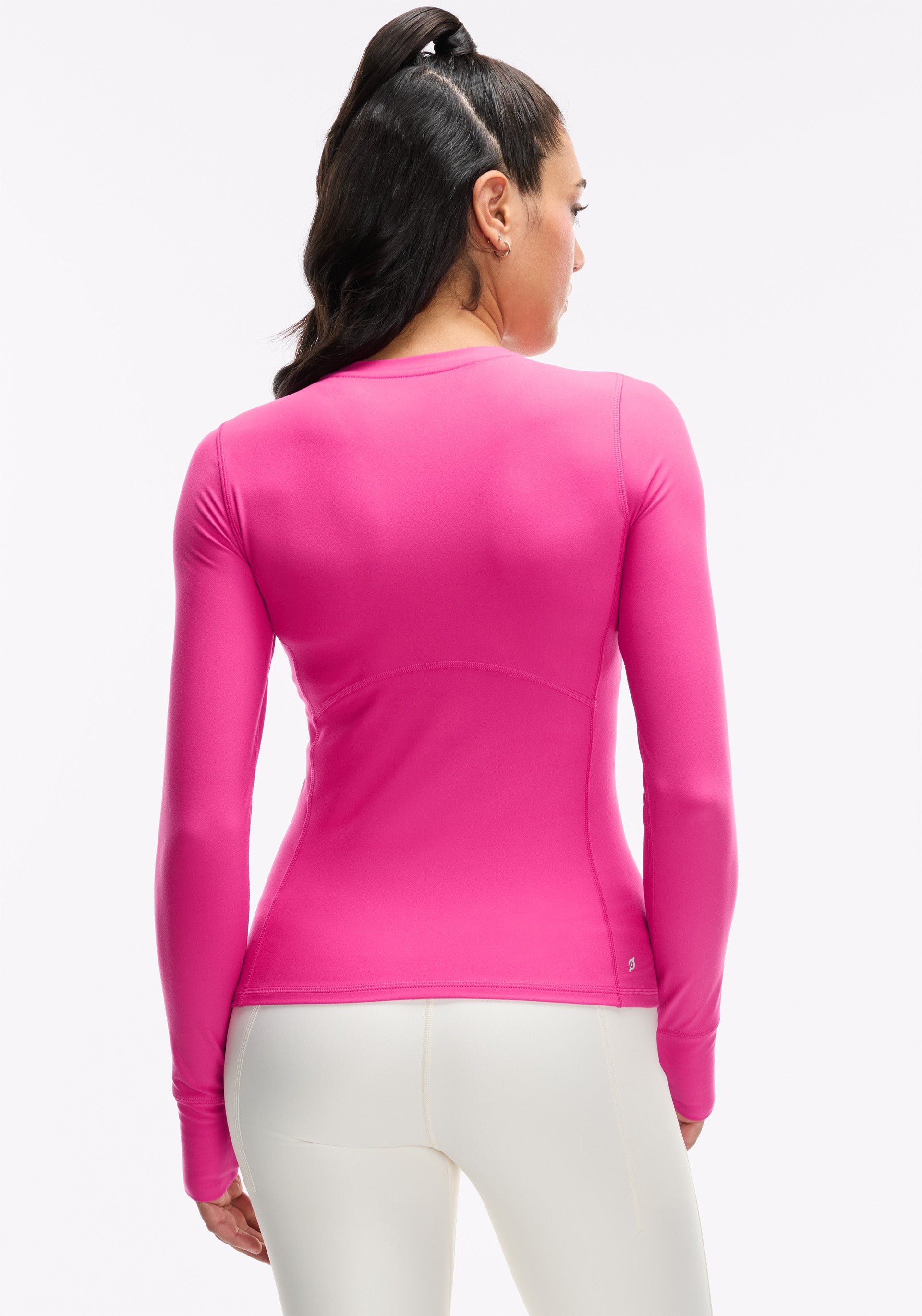 Crew neck, long sleeve with princess seams for shaping and thumbholes