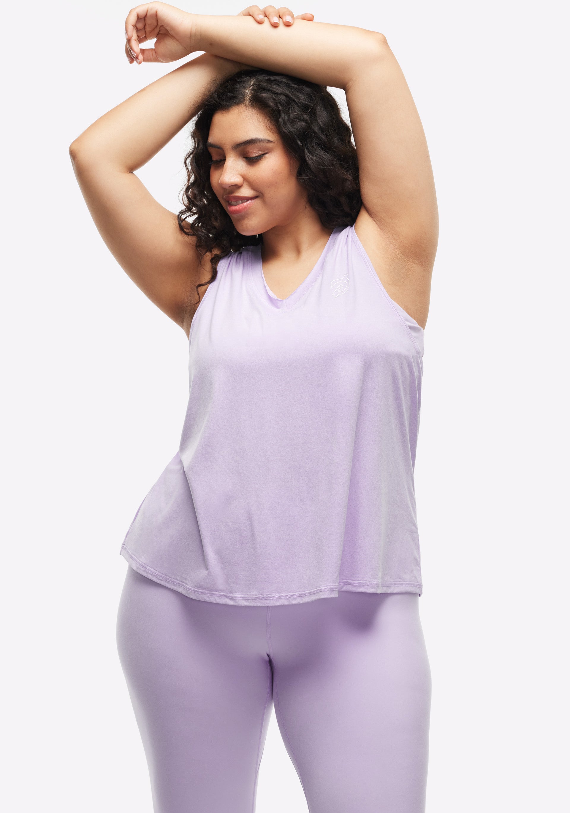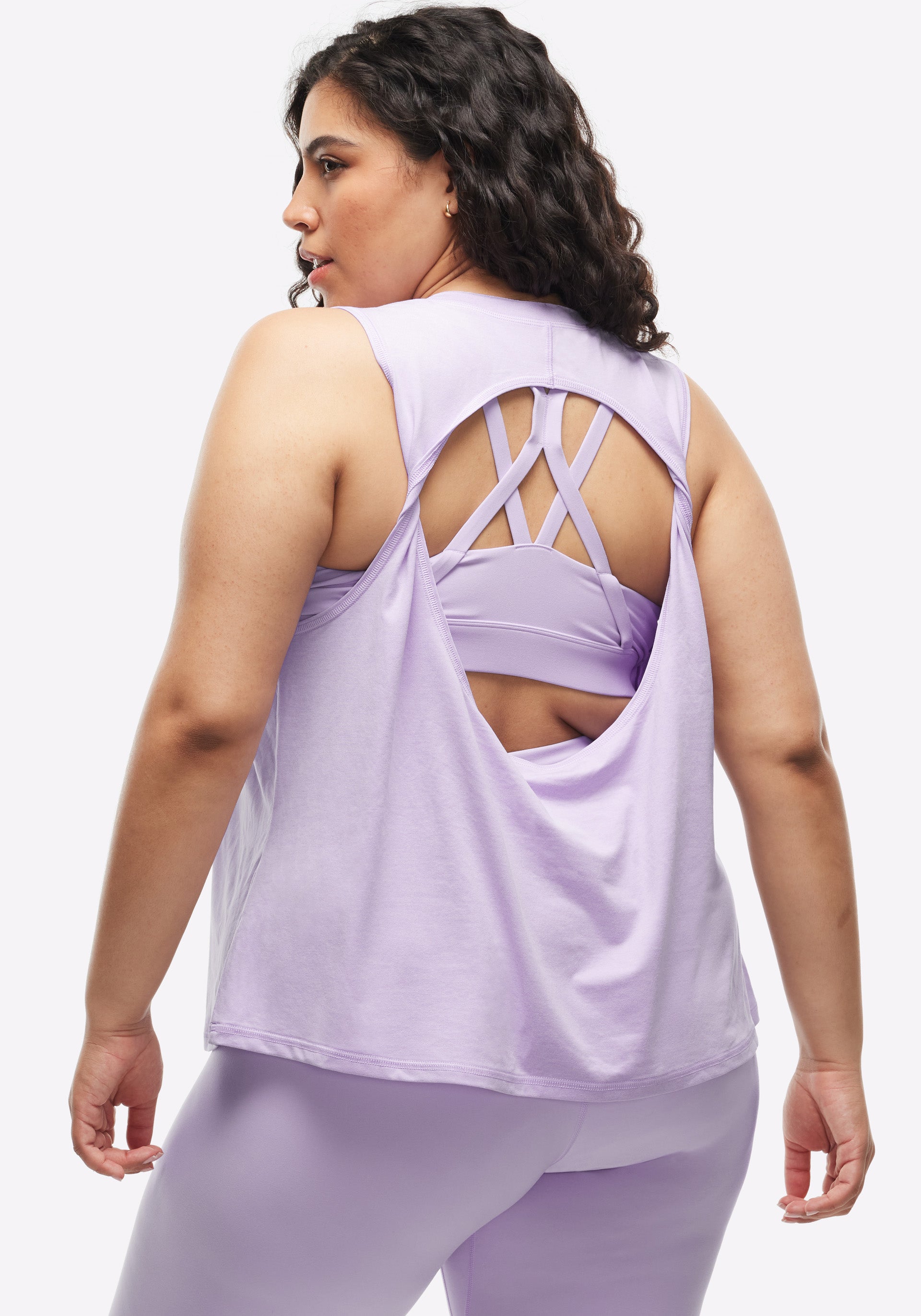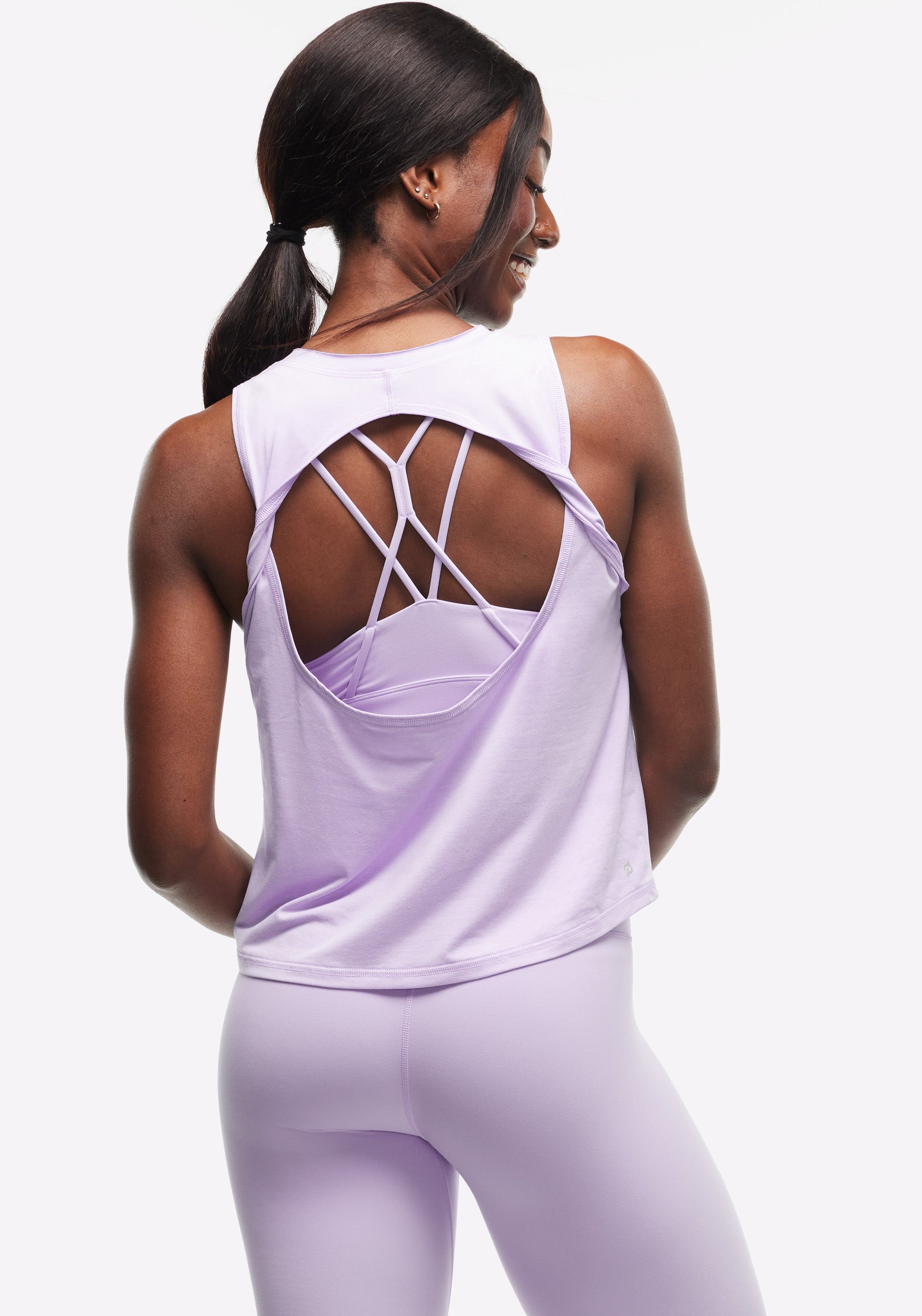 • Soft V-neck tank with double twist, open back detail and a meet and greet length