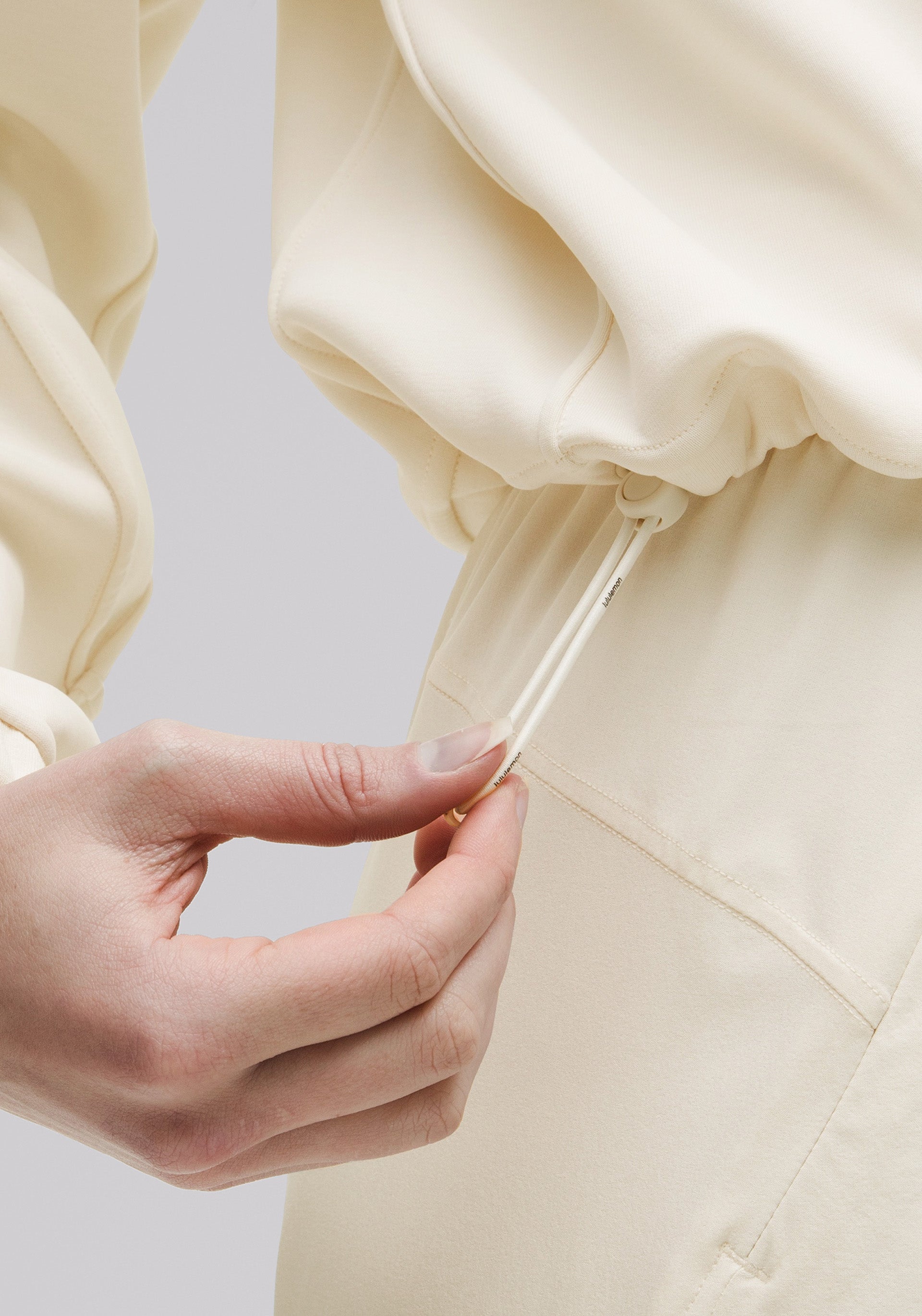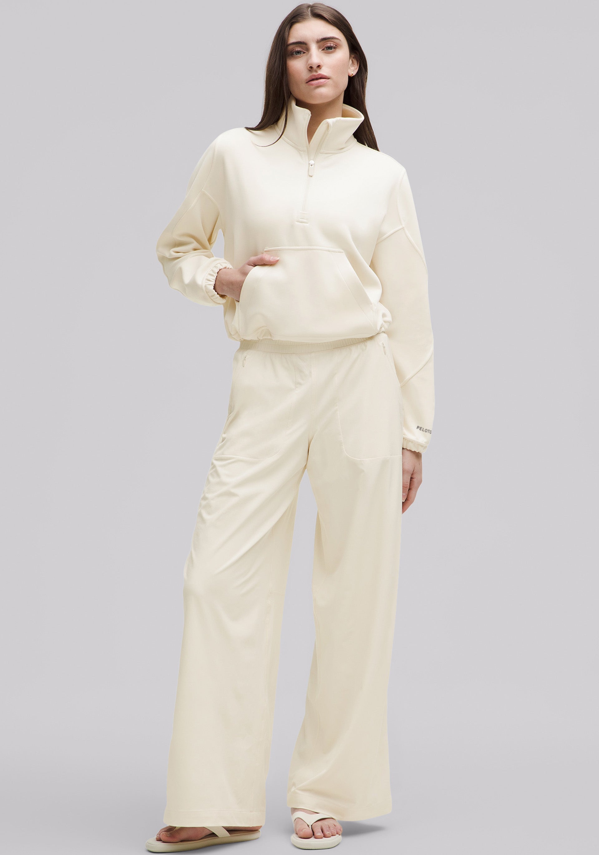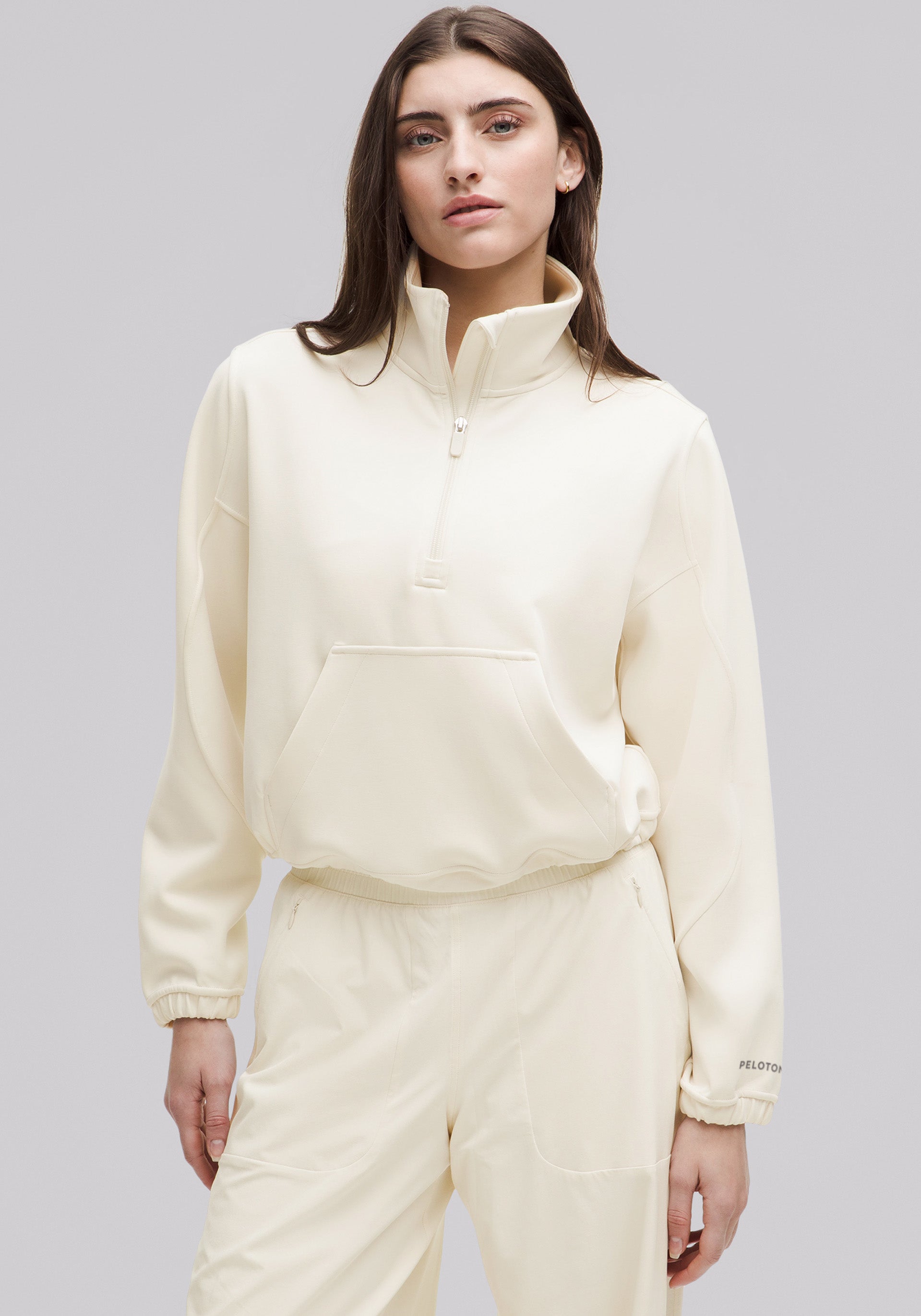 Relaxed half zip with kangaroo pocket, hidden card sleeve, zipper garage and placket, and a cinchable hem for a custom fit
