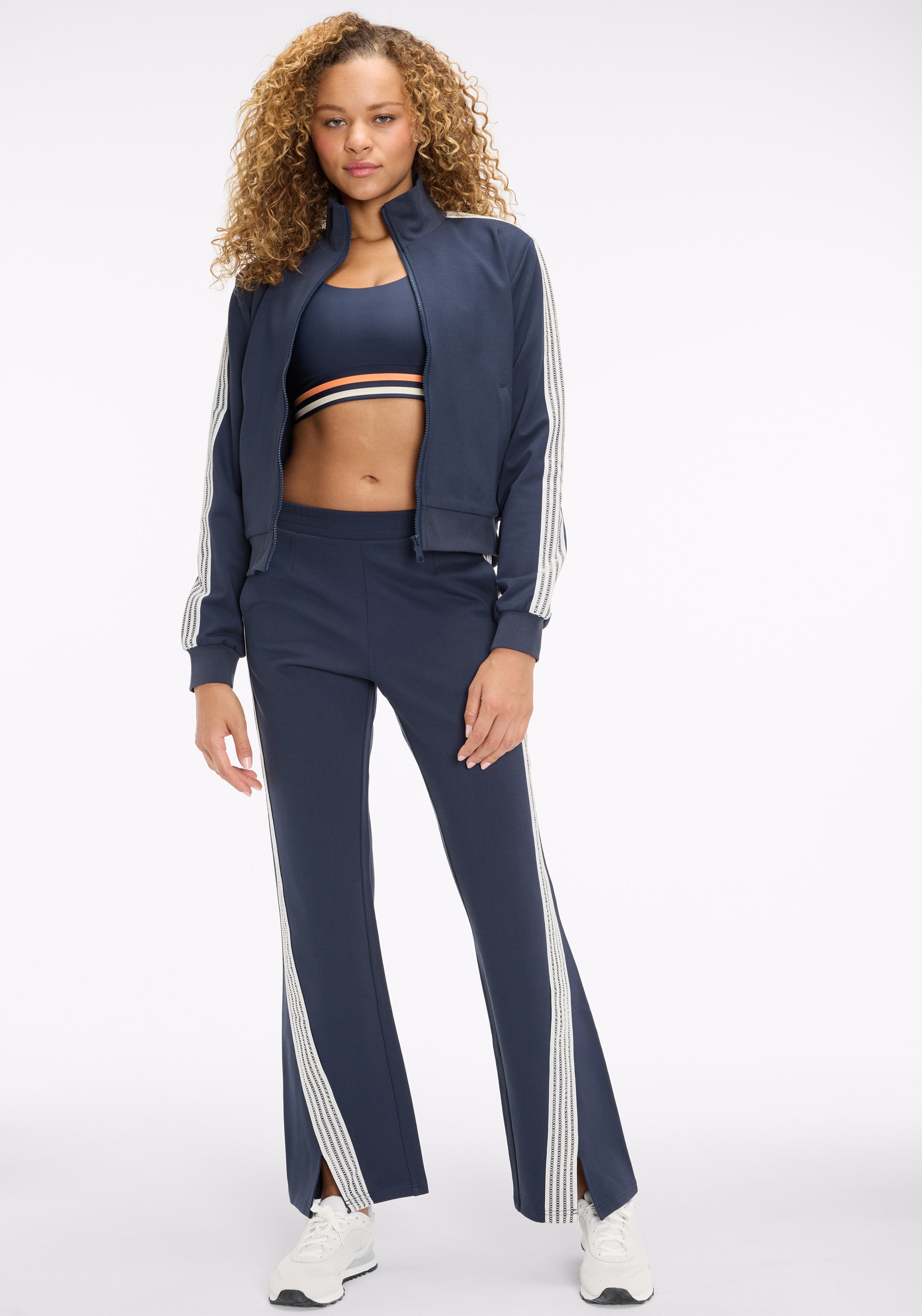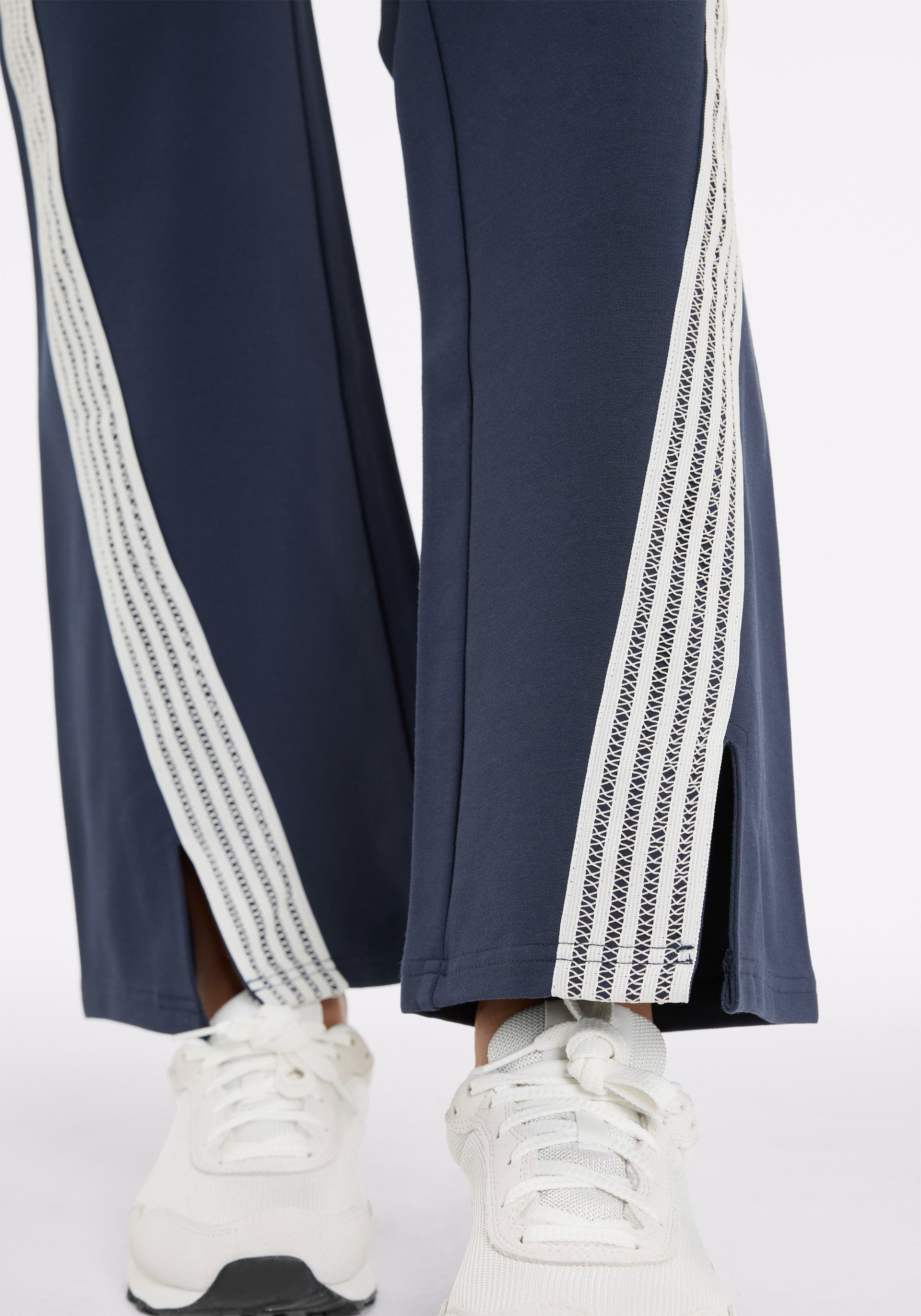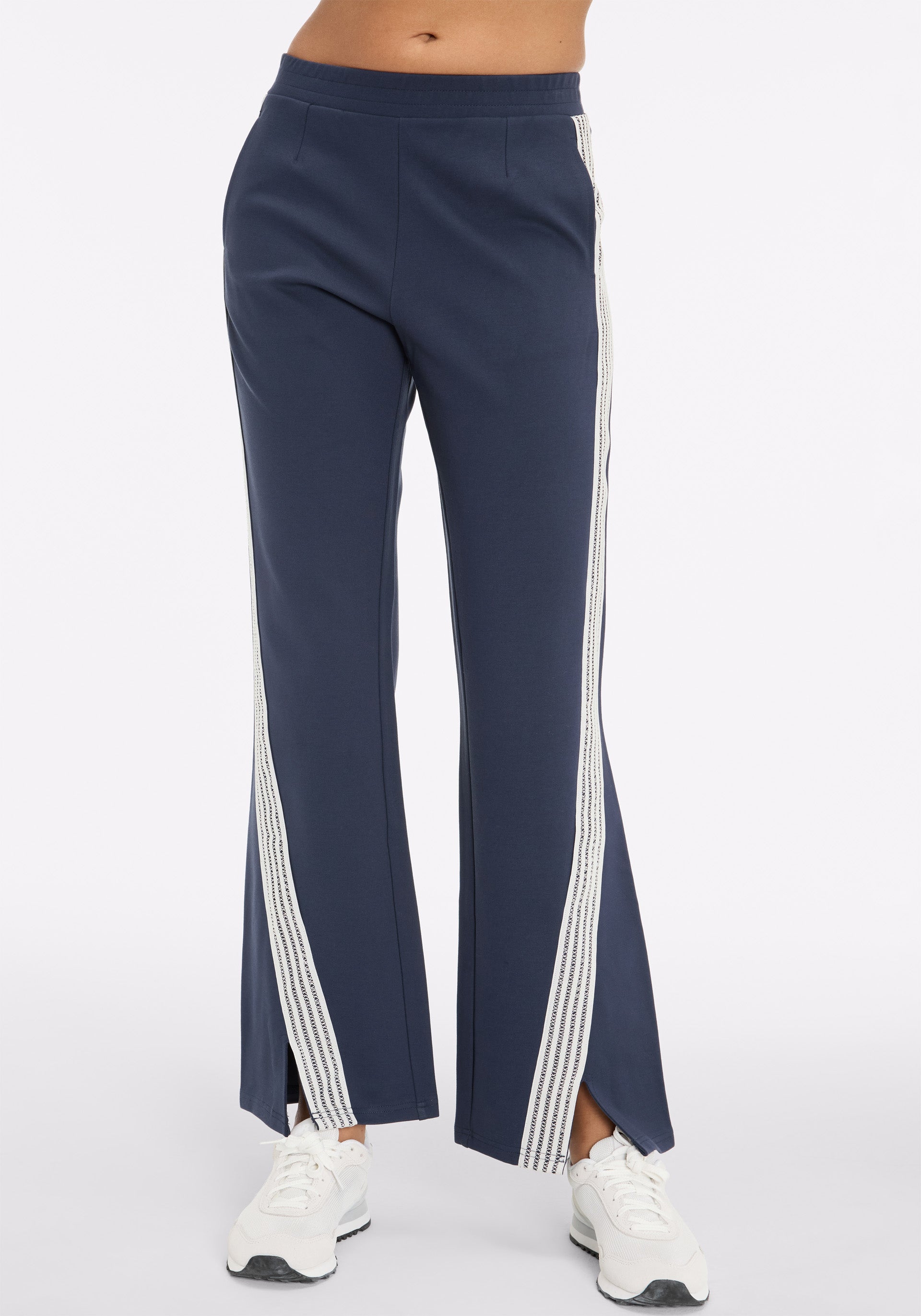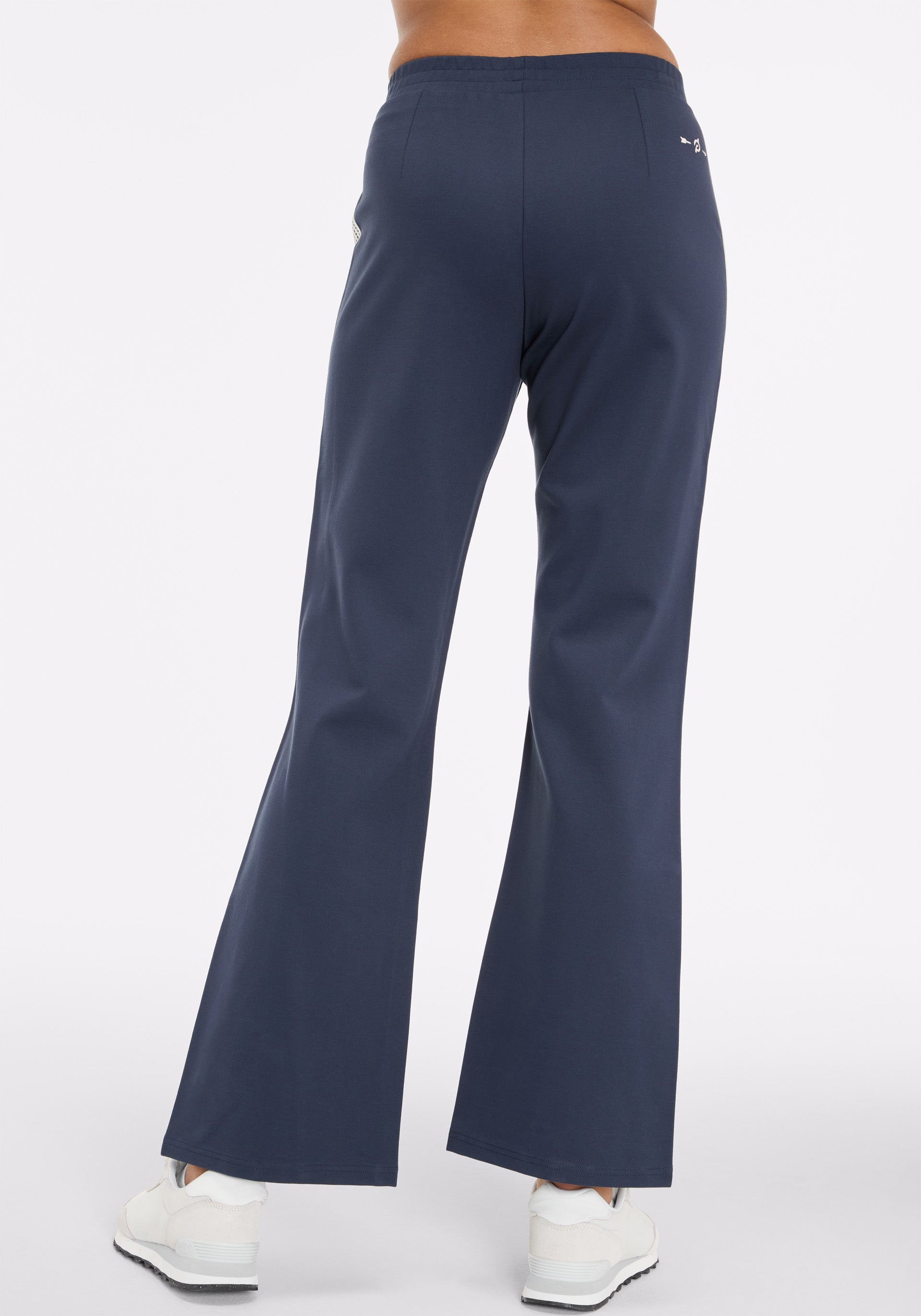 Soft tailored flare pant with elasticated waistband, side seam pockets, and lattice tape at outer leg
