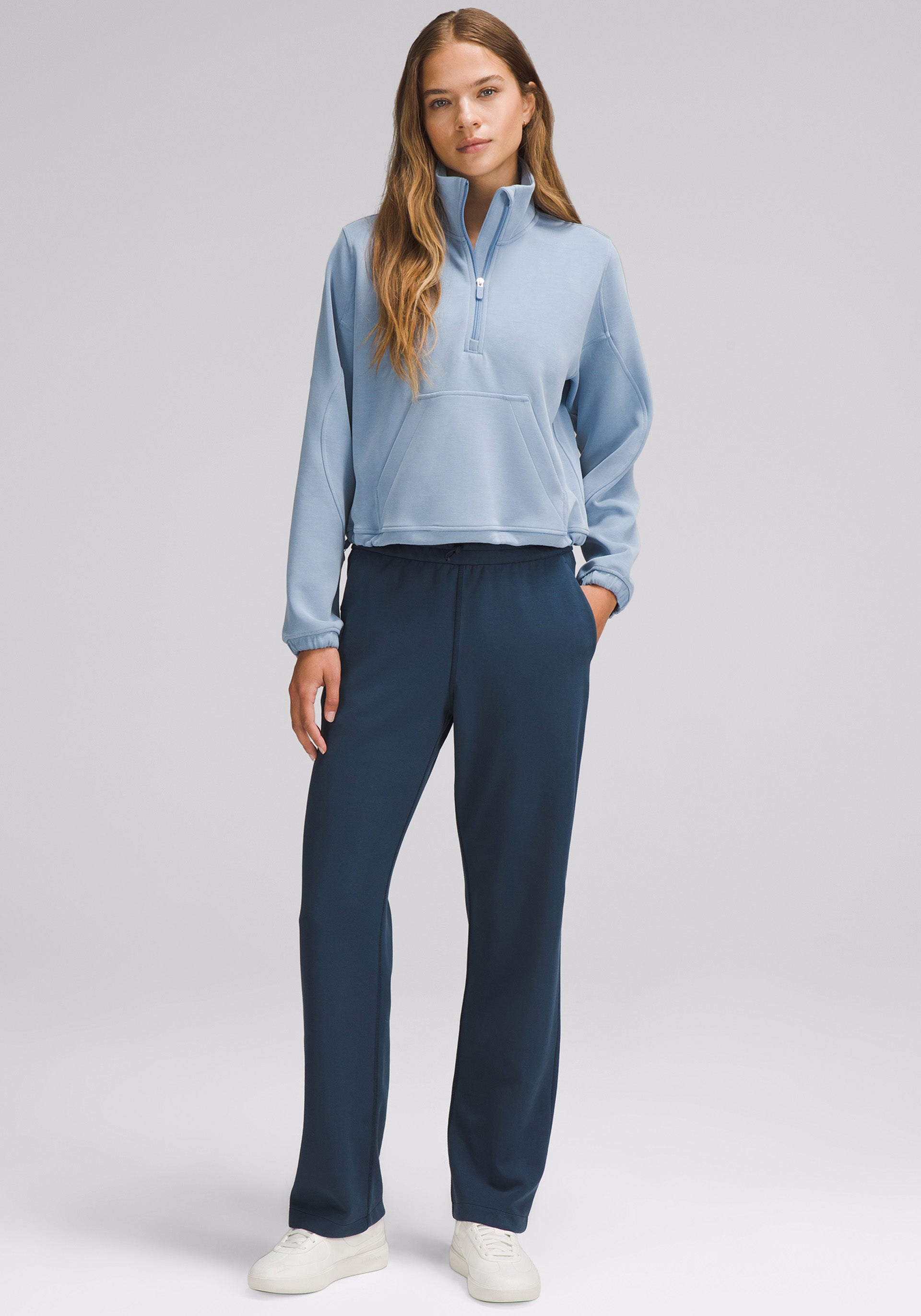 Relaxed half zip with kangaroo pocket, hidden card sleeve, zipper garage and placket, and a cinchable hem for a custom fit