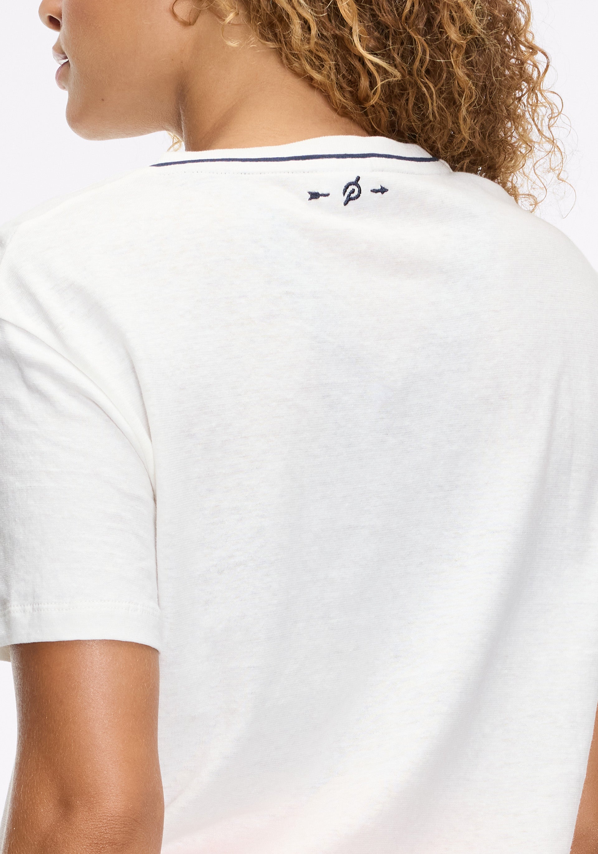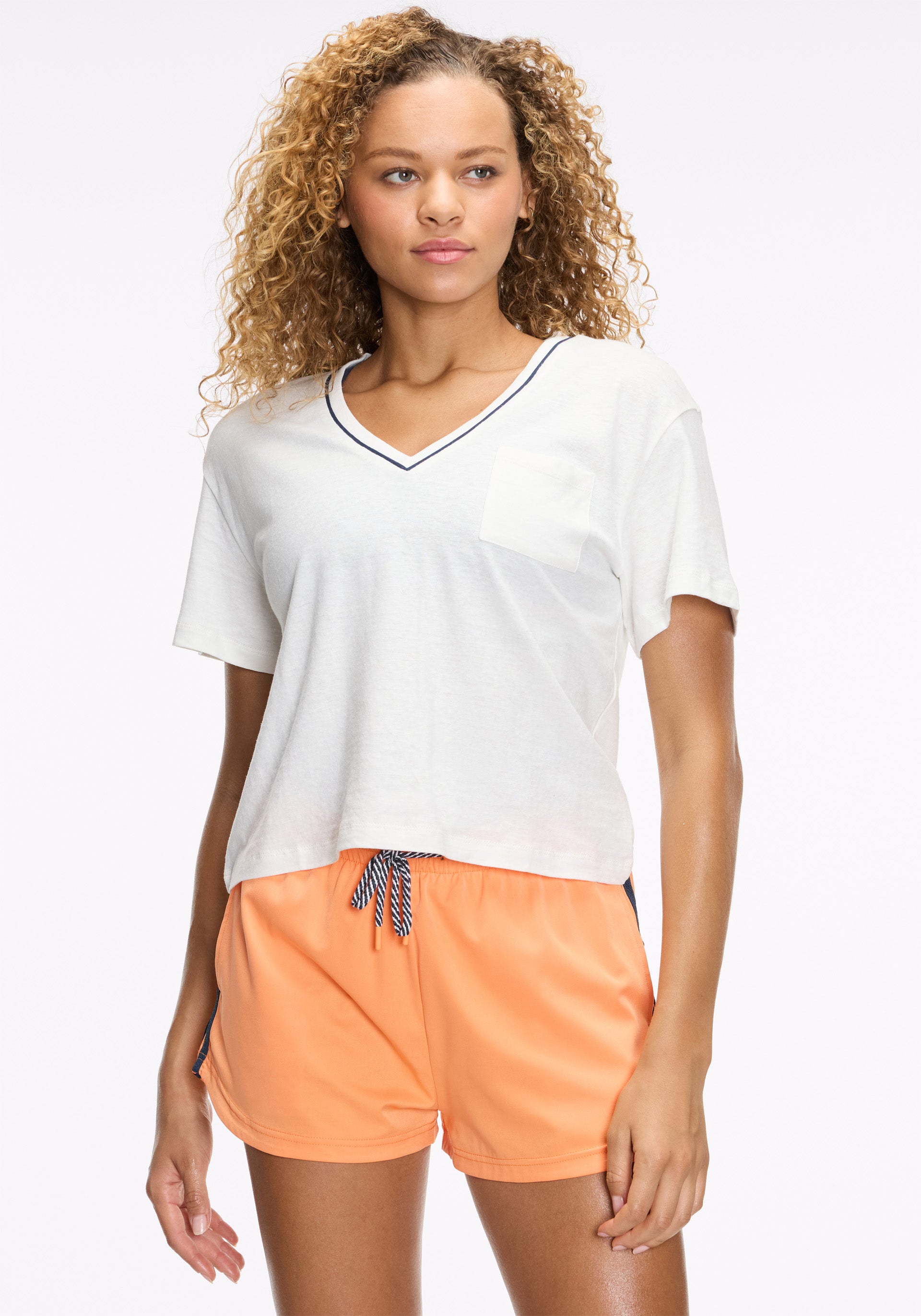• Boxy, v-neck short sleeve with mini patch pocket at chest and ribbed neckline with contrast piping