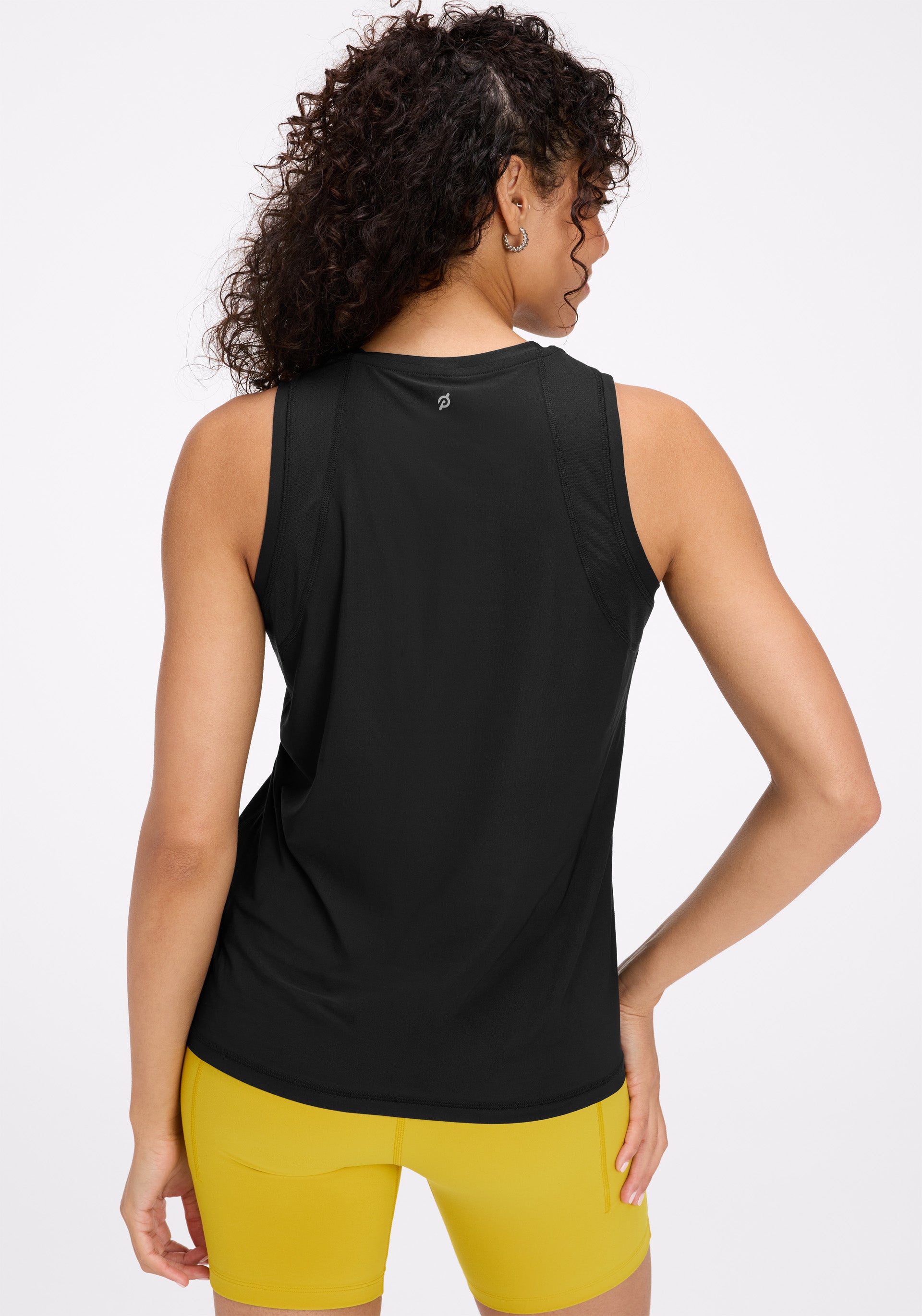Muscle tank with a meet and greet length, self neckline and hem as well as mesh piecing at armhole
