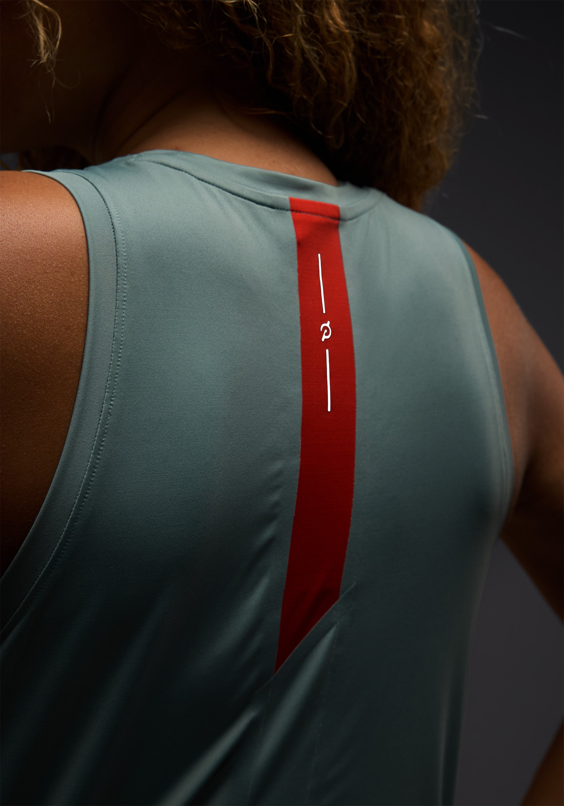 Crewneck tank top with colorblock stripe, mesh at center back for ventilation, and bonded double hem to reduce chafe