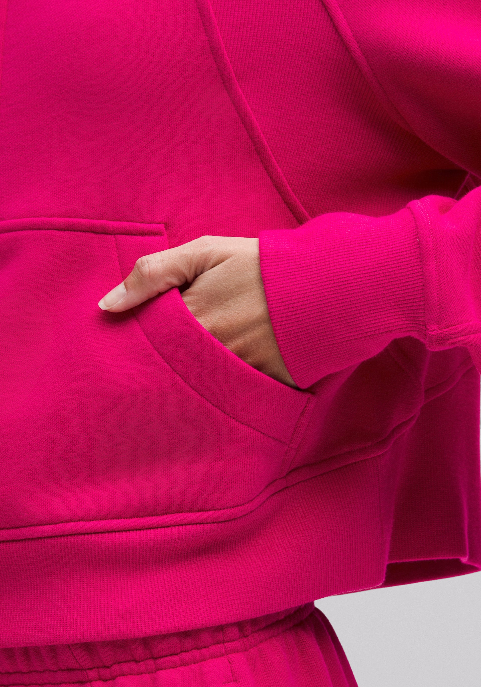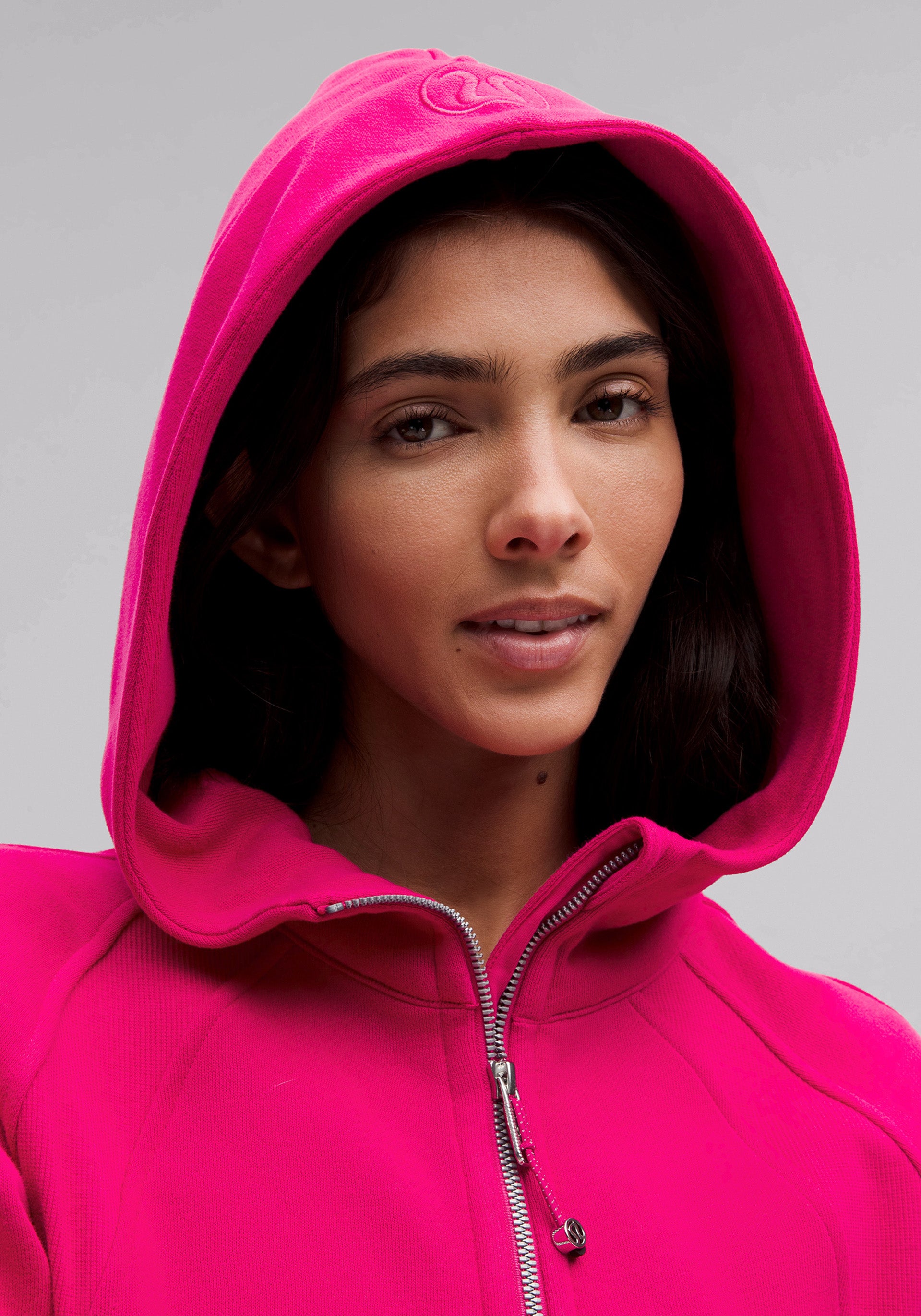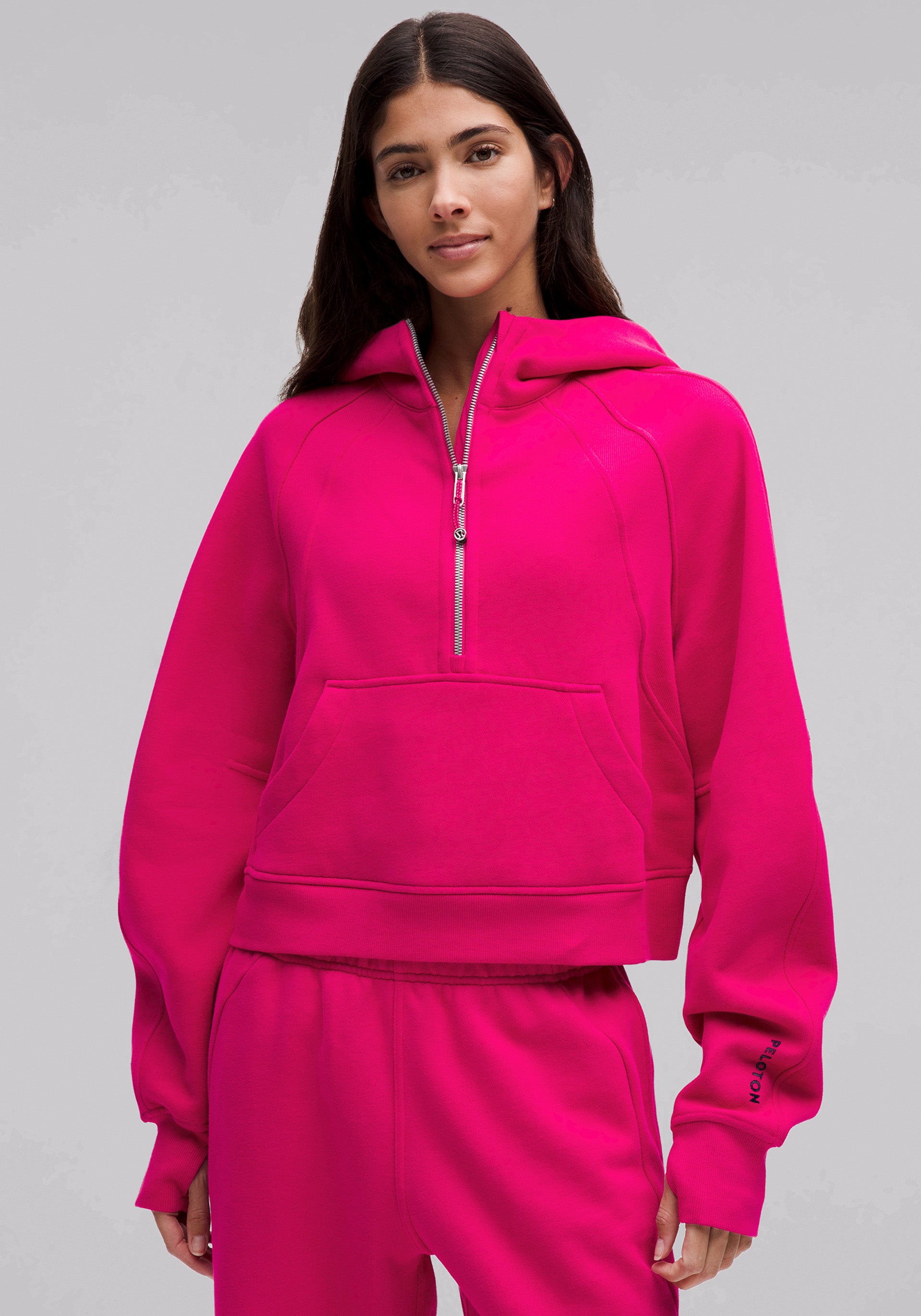 Half-zip, hooded pullover with elastic zipper pull that doubles as an emergency hair tie, kangaroo pocket with hidden phone sleeve, zipper garage, and thumbholes