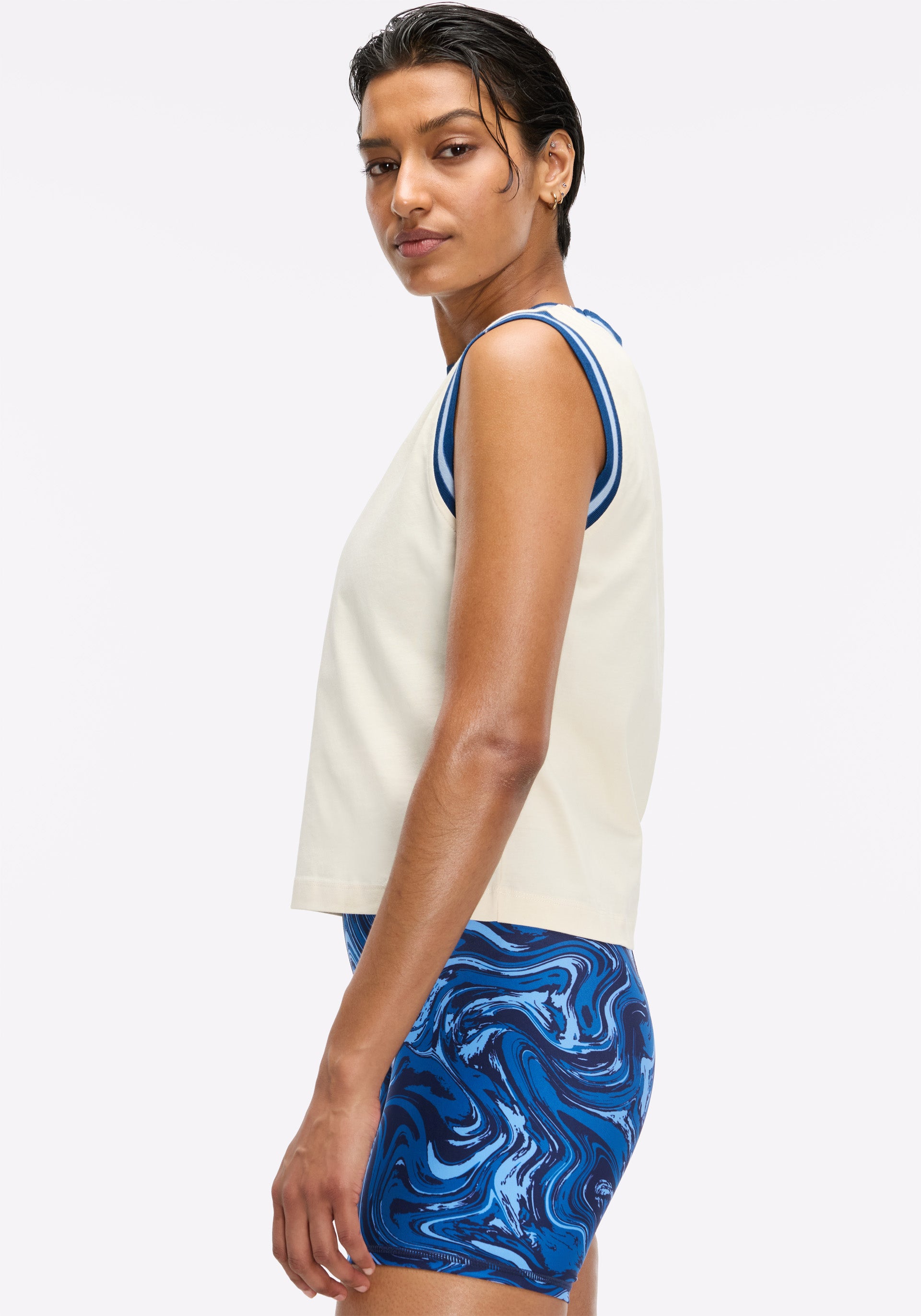 • Muscle tank that hits at the waist with contrast trim at neck and armholes