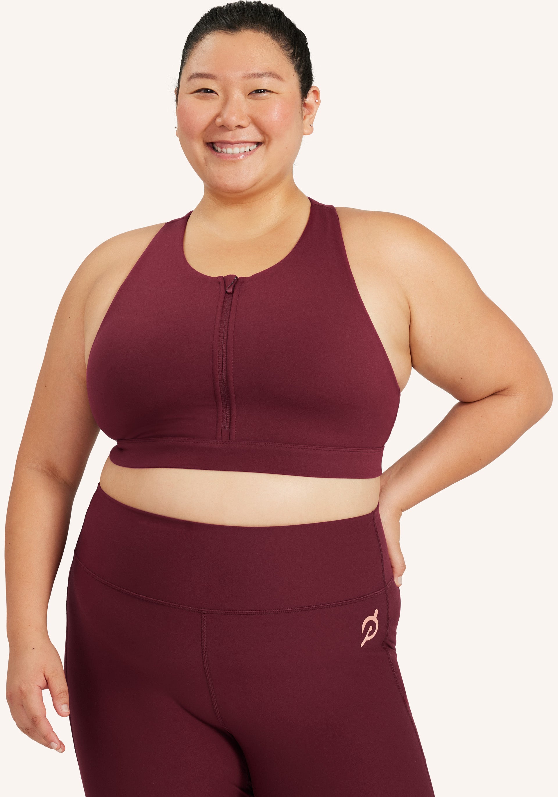 • Low-Medium support bra with front zipper detail, contrast insert, half moon open back detail for added ventilation, and removable pads