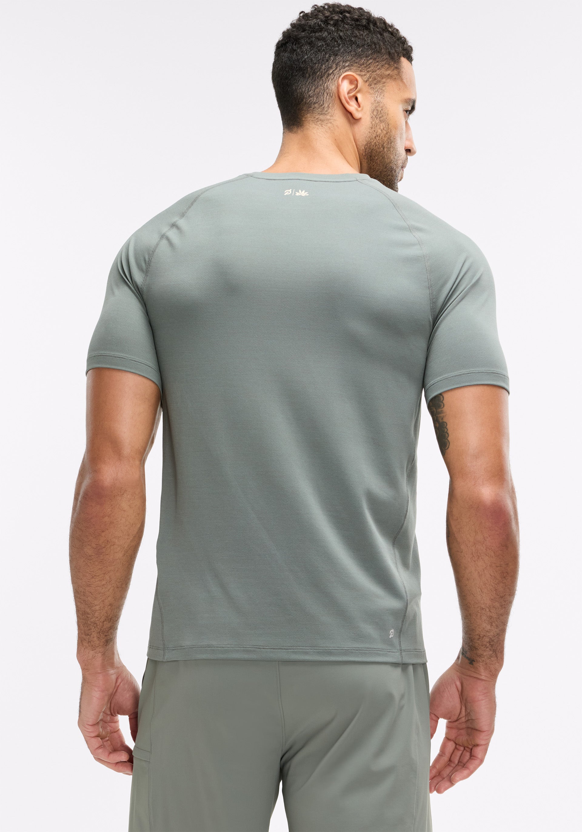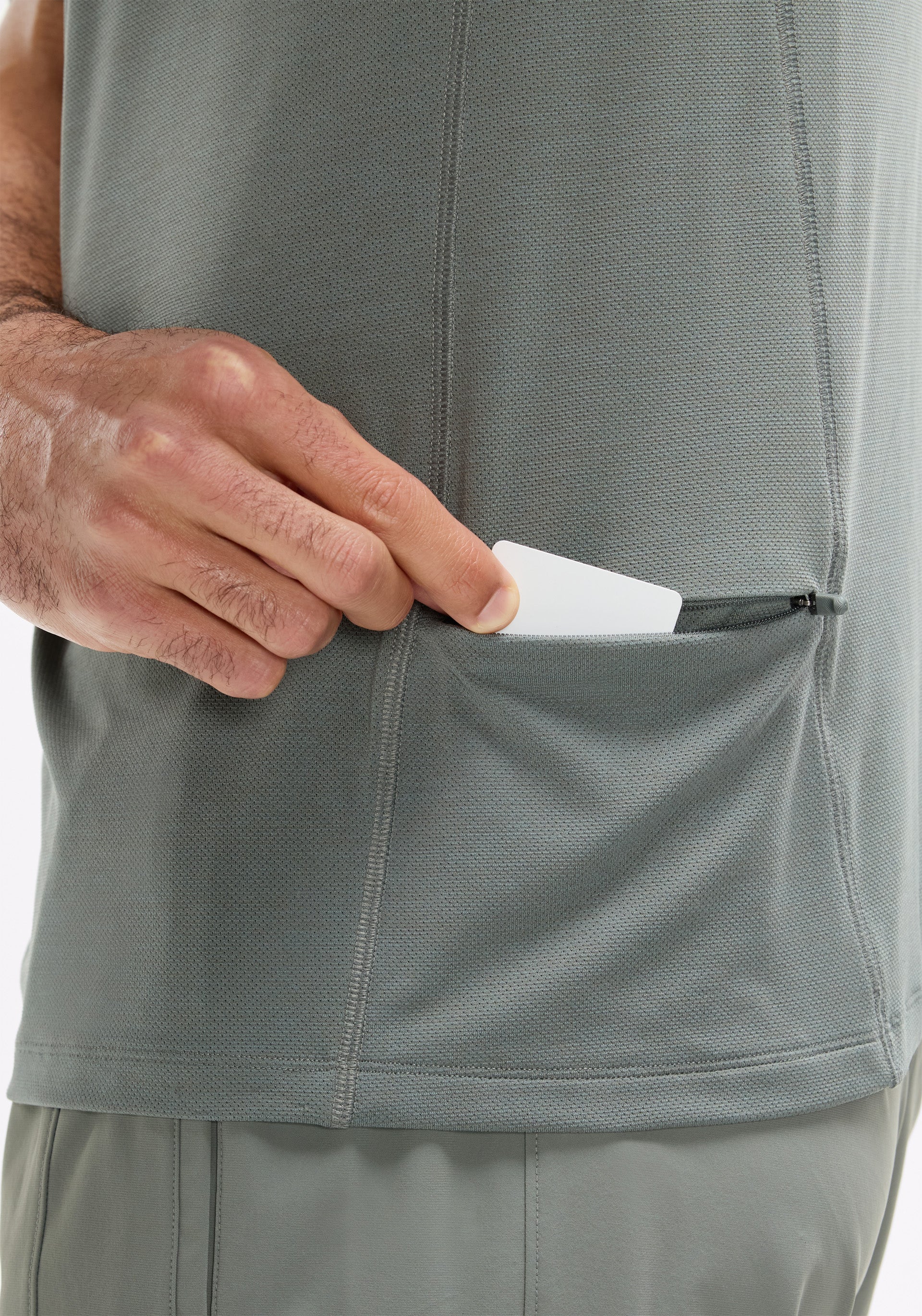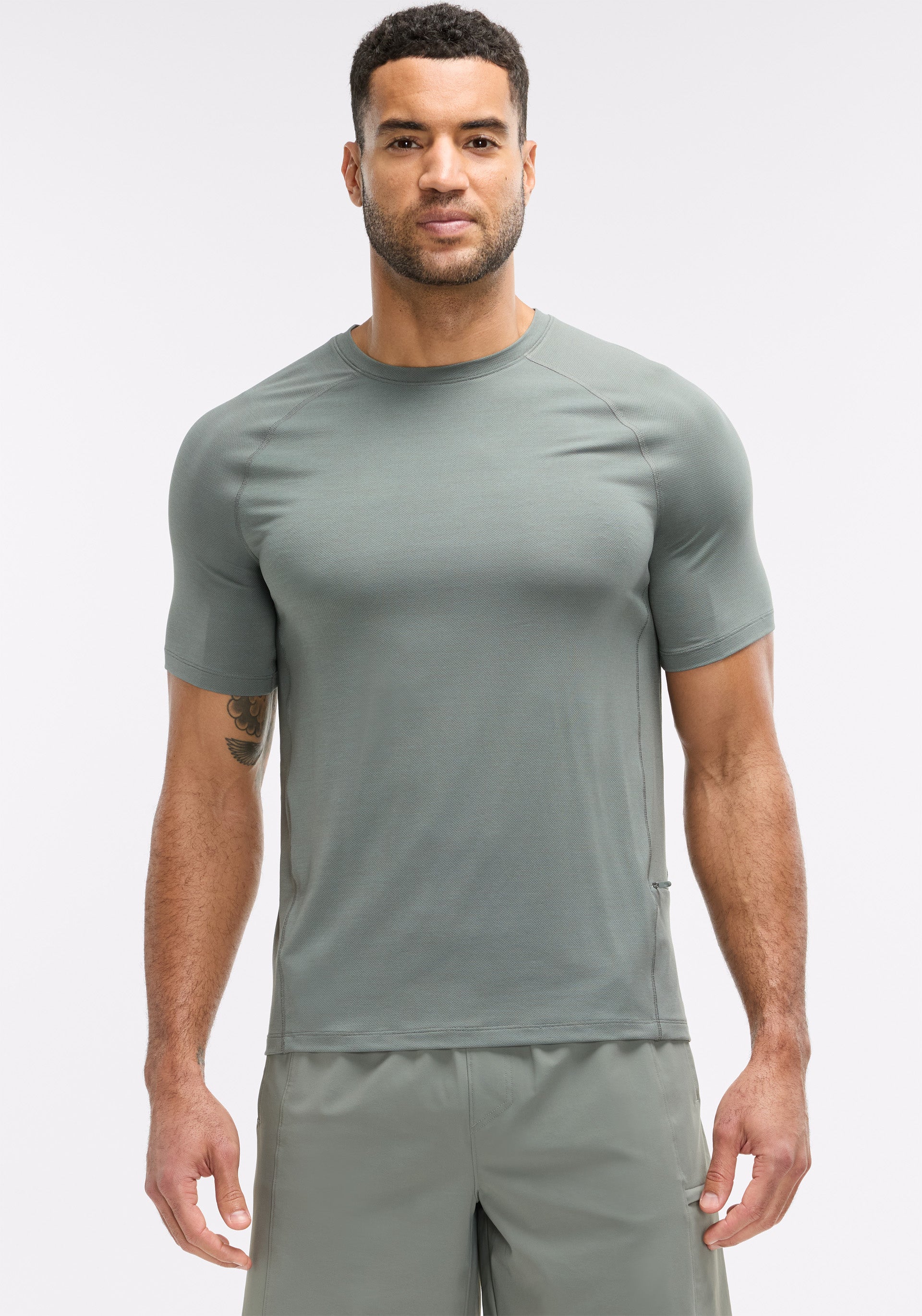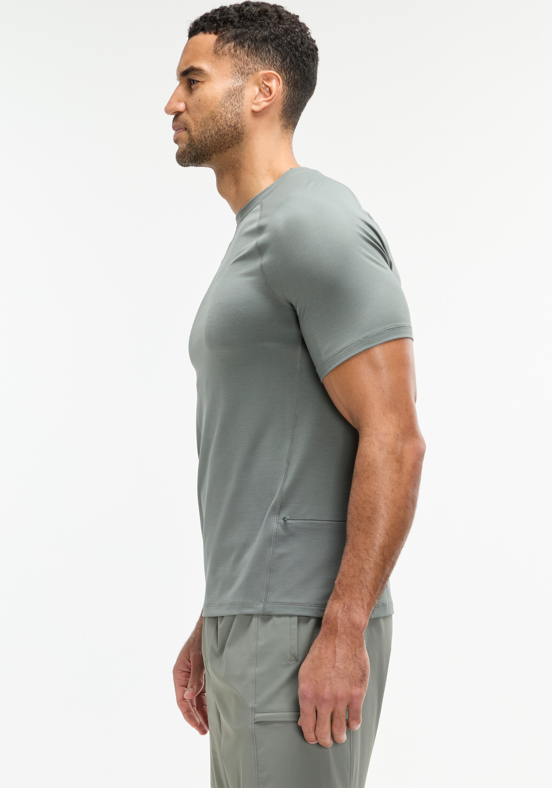Crewneck, raglan short sleeve with forward side seams and zipper stash pocket at left side