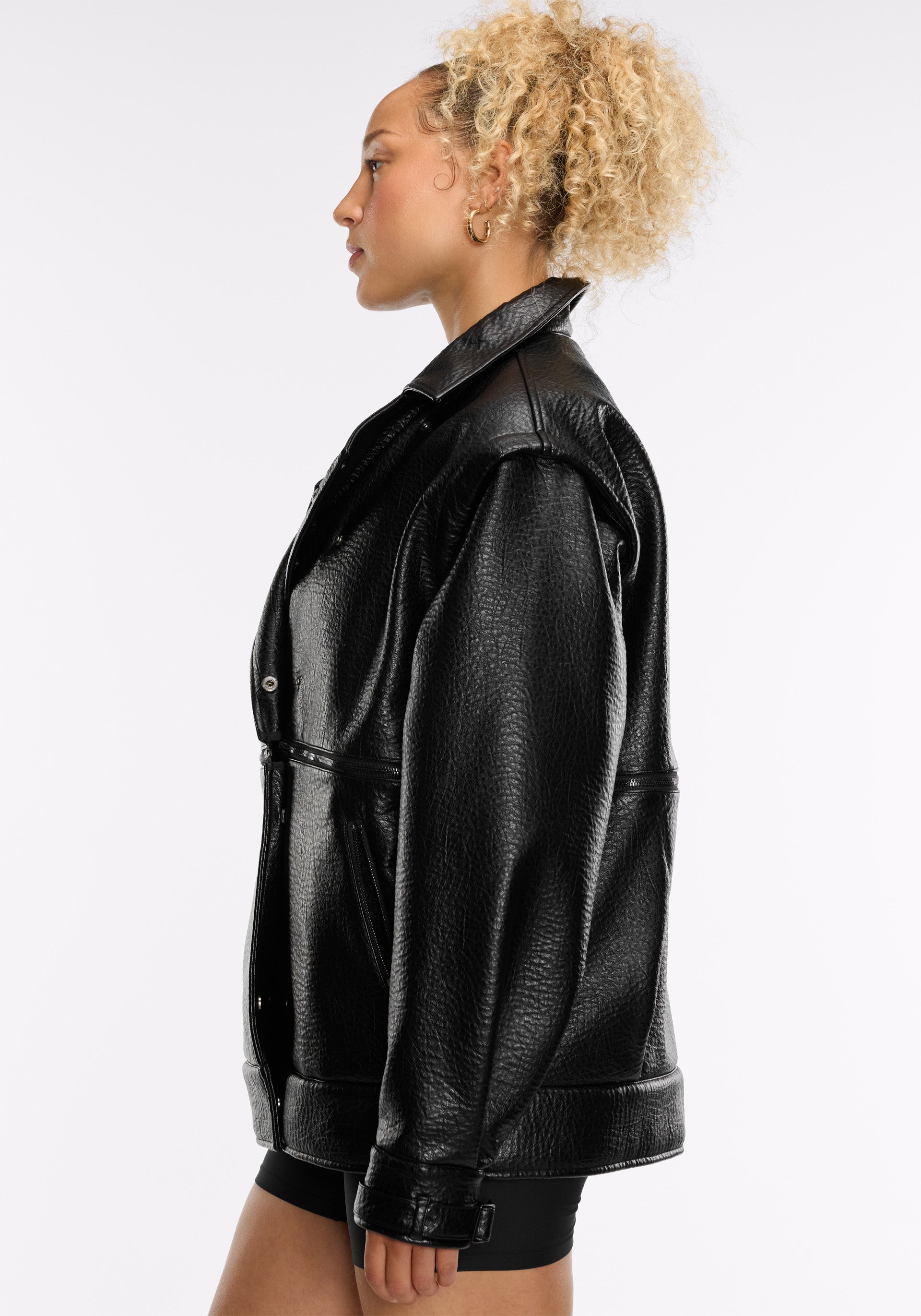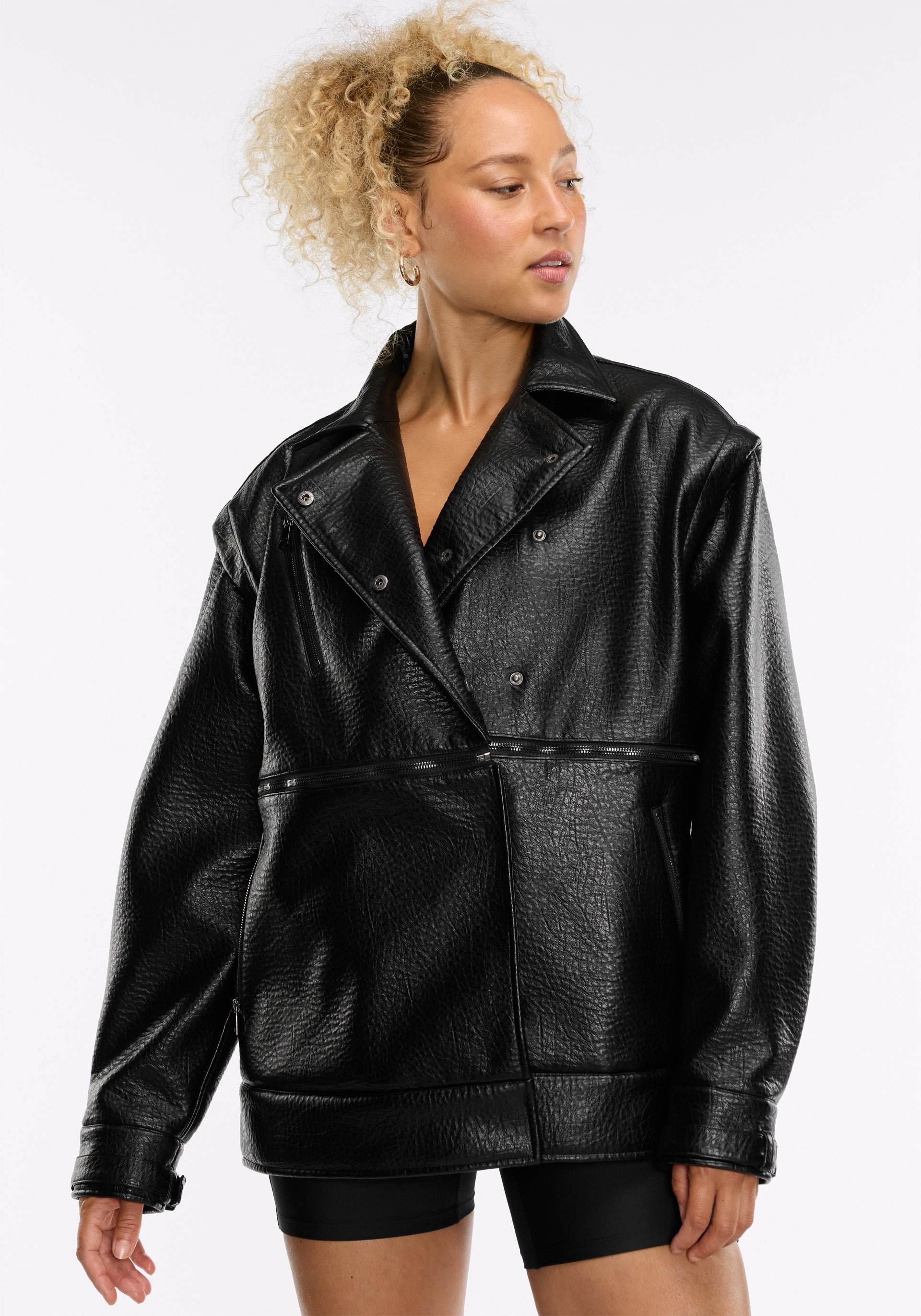 Convertible moto jacket with faux shearling interior, zippered hand pockets, adjustable cuffs, and zippered chest pocket
